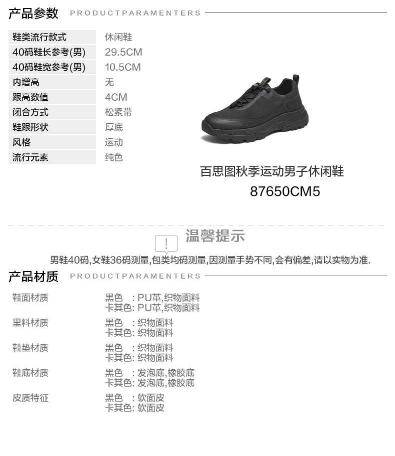| 风格:运动 | 色系:黑色 | 跟高数值:4CM | 40码鞋宽参考(男):10.5CM | 性别:男子 |