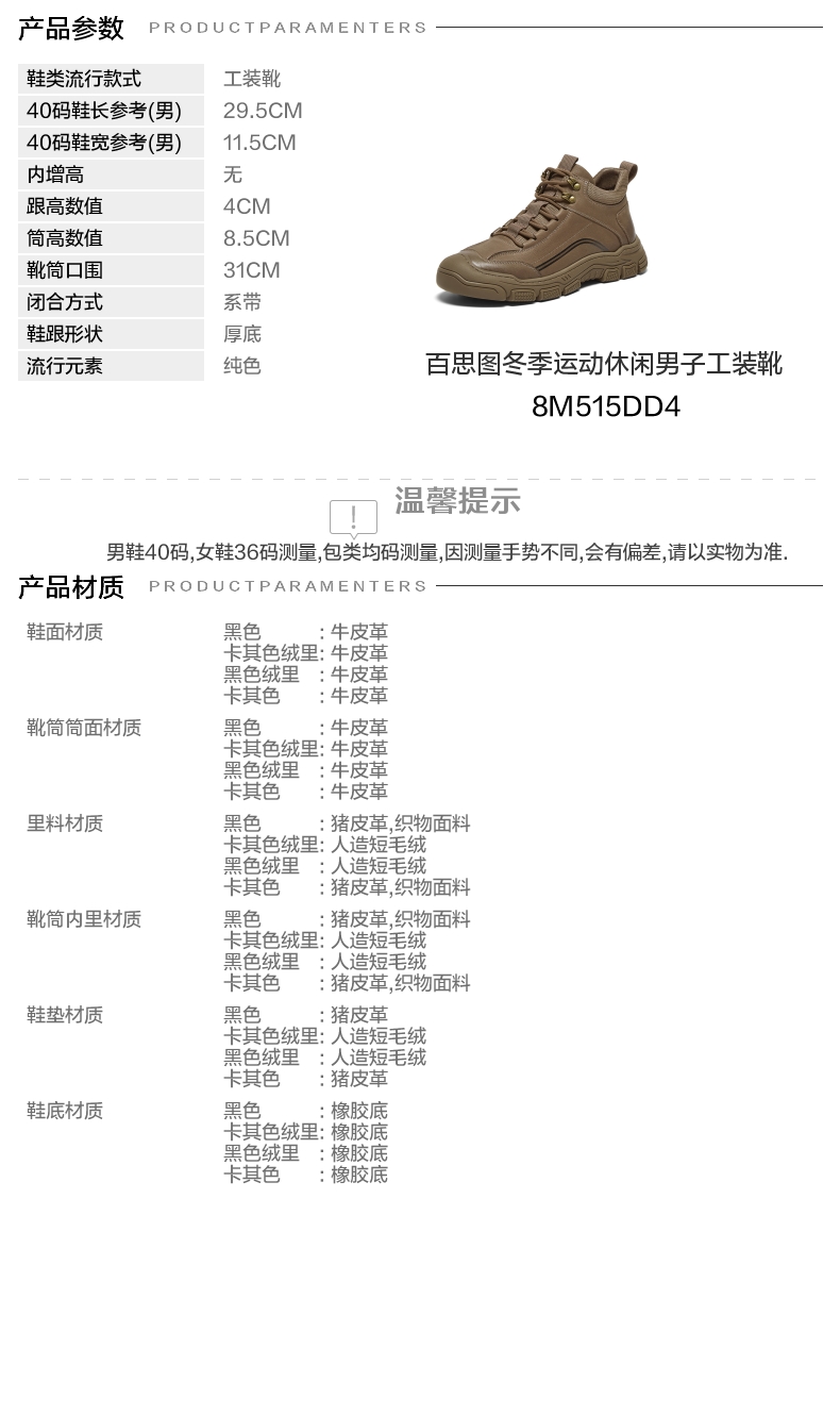 | 闭合方式:系带 | 40码鞋宽参考(男):11.5CM | 靴筒口围:31CM | 上市时间:2024年冬季 | 鞋类流行款式:工装靴 |