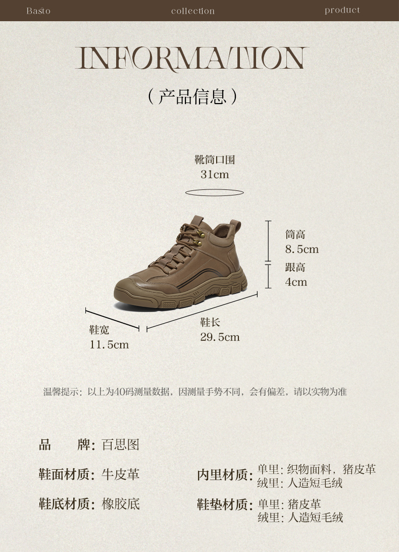 | 40码鞋长参考(男):29.5CM | 鞋底材质:橡胶底 | 靴筒内里材质:人造短毛绒 | 内增高:无 | 鞋面材质:牛皮革 |