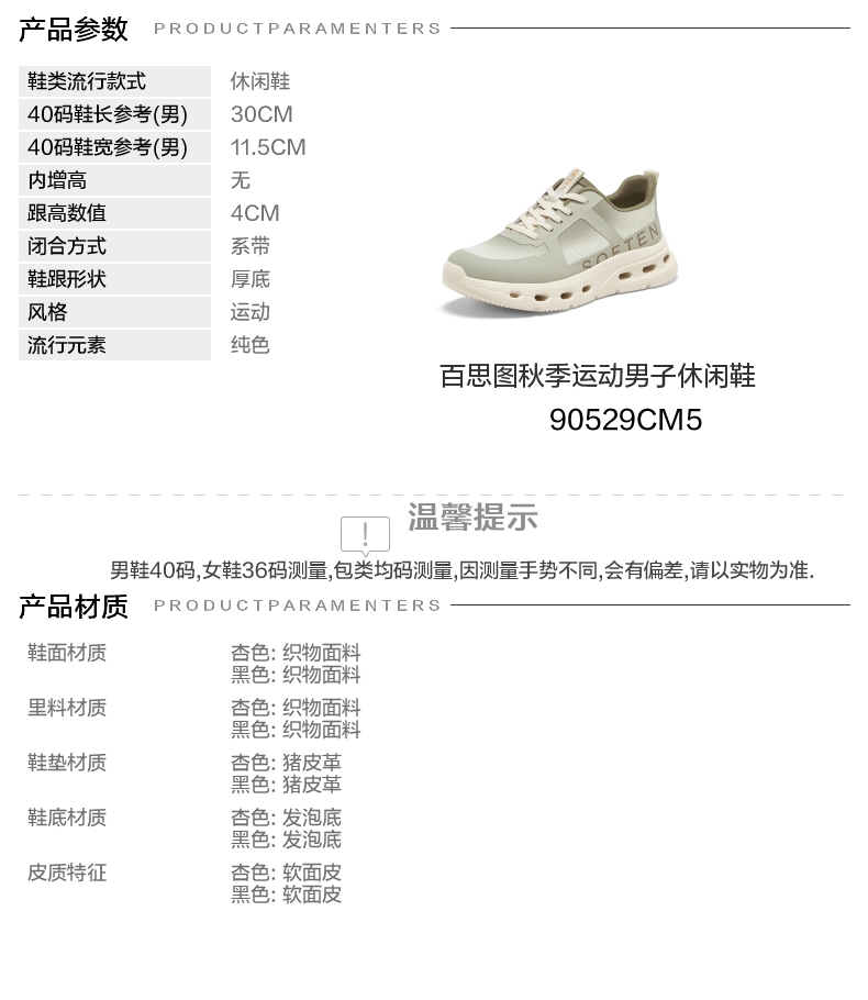 | 风格:运动 | 色系:杏色 | 跟高数值:4CM | 40码鞋宽参考(男):11.5CM | 性别:男子 |