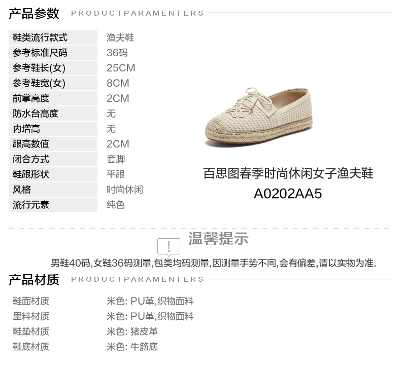 | 色系:米色 | 参考标准尺码:36码 | 跟高数值:2CM | 性别:女子 | 里料材质:织物面料PU革 |