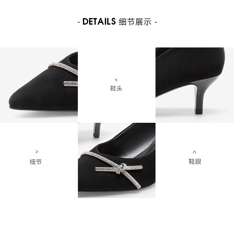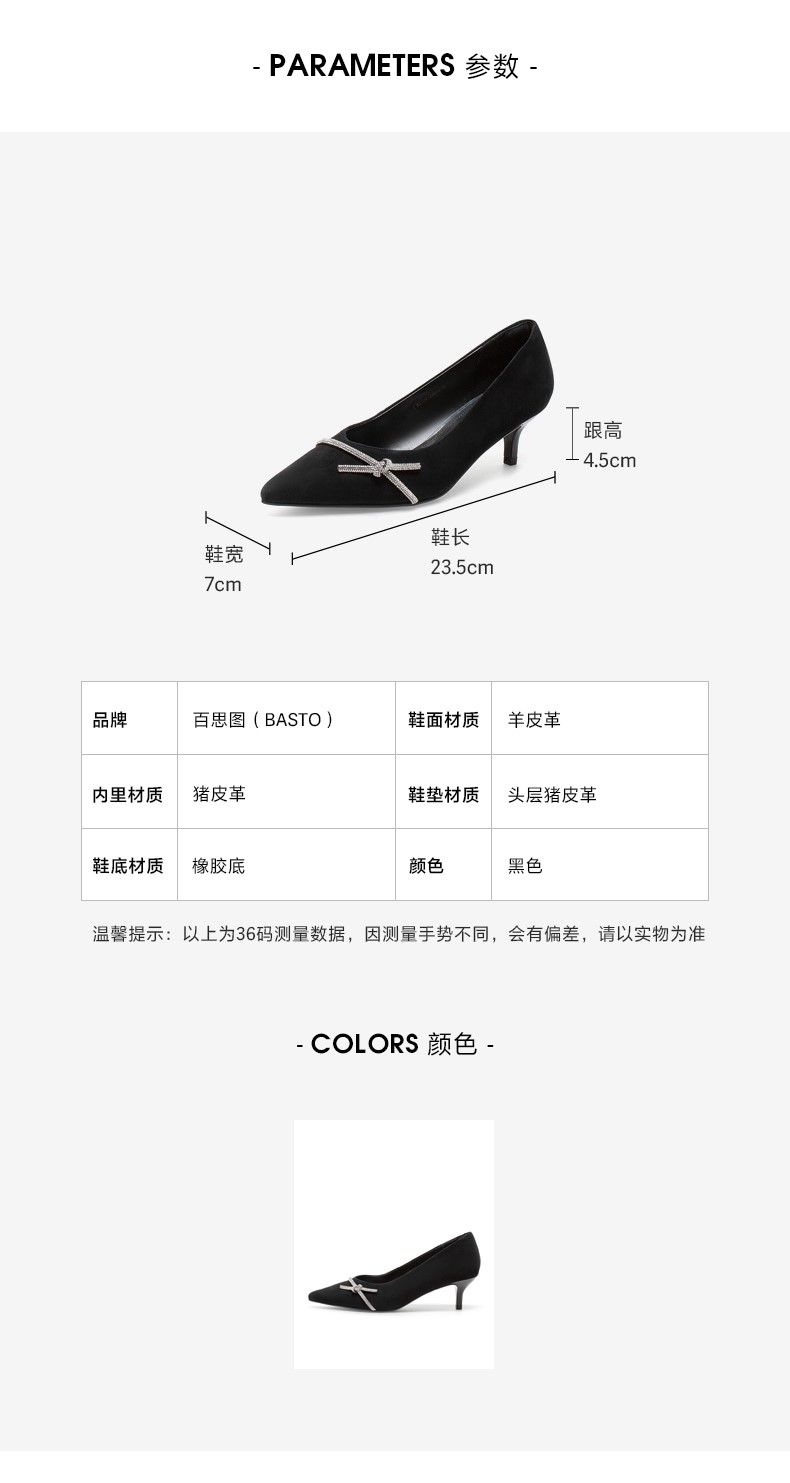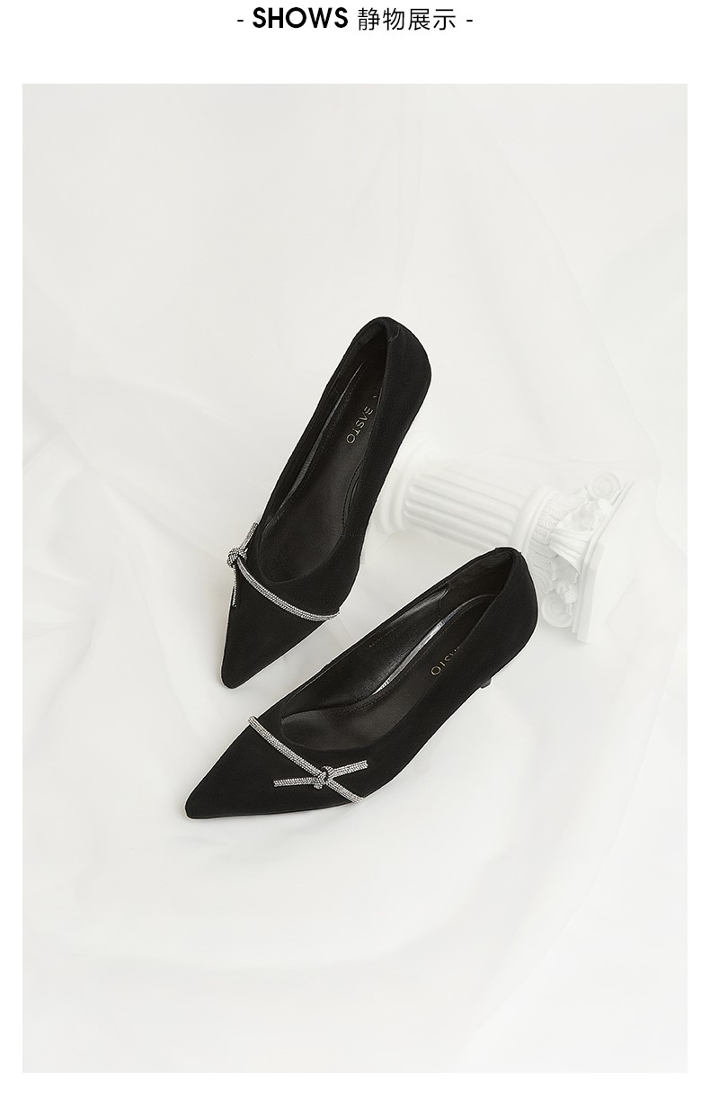 | 鞋头款式:尖头 | 鞋底材质:橡胶底 | 鞋面图案:纯色 | 内增高:无 | 鞋跟形状:细跟 |
