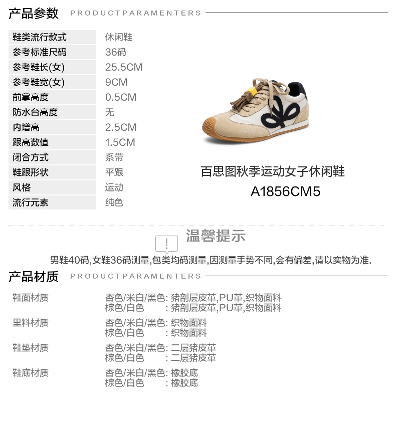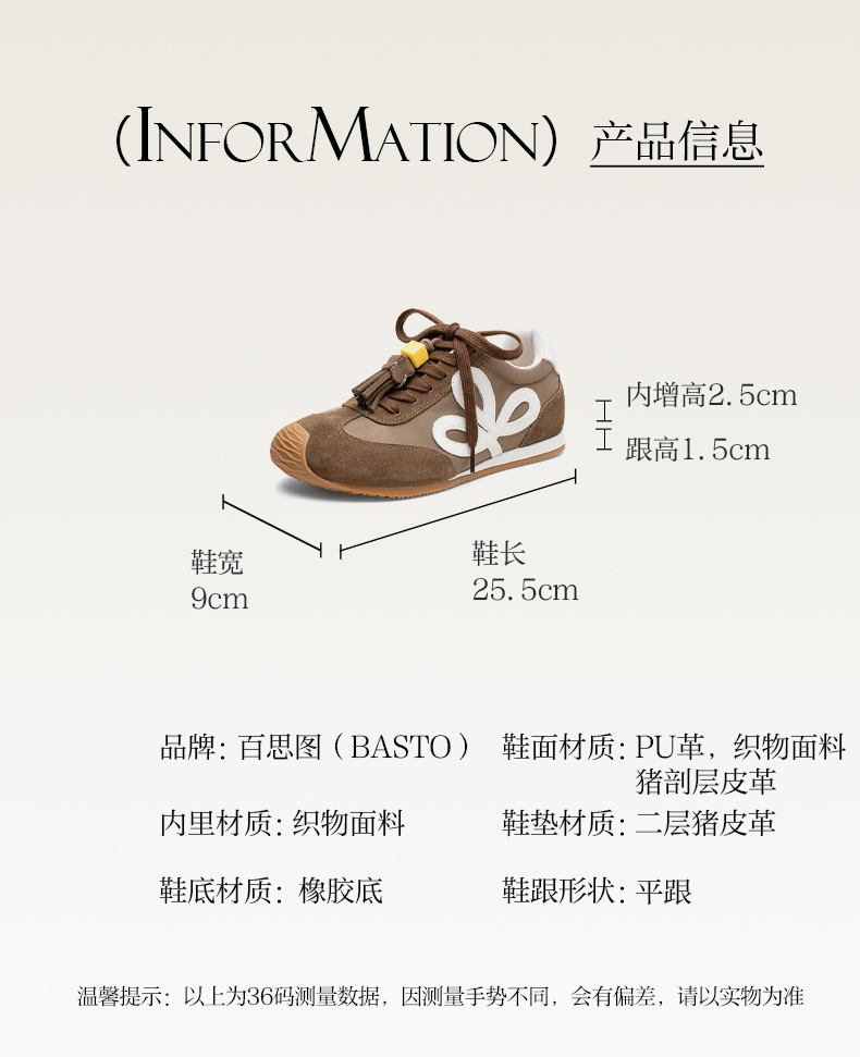 | 鞋帮:低帮 | 鞋底材质:橡胶底 | 内增高:2.5CM | 鞋面材质:PU革猪剖层皮革织物面料 | 闭合方式:系带 |