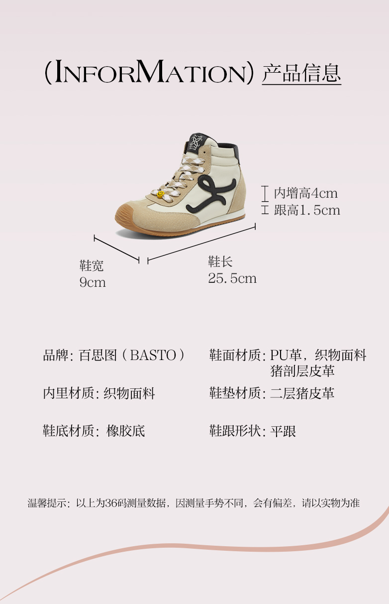 | 鞋底材质:橡胶底 | 靴筒内里材质:织物面料 | 内增高:4CM | 鞋面材质:织物面料PU革猪剖层皮革 | 闭合方式:系带 |