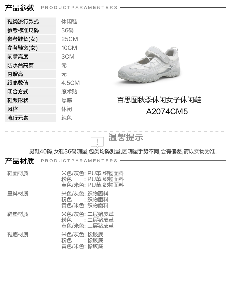| 色系:米色 | 跟高数值:4.5CM | 性别:女子 | 里料材质:织物面料 | 制鞋工艺:胶贴皮鞋 |