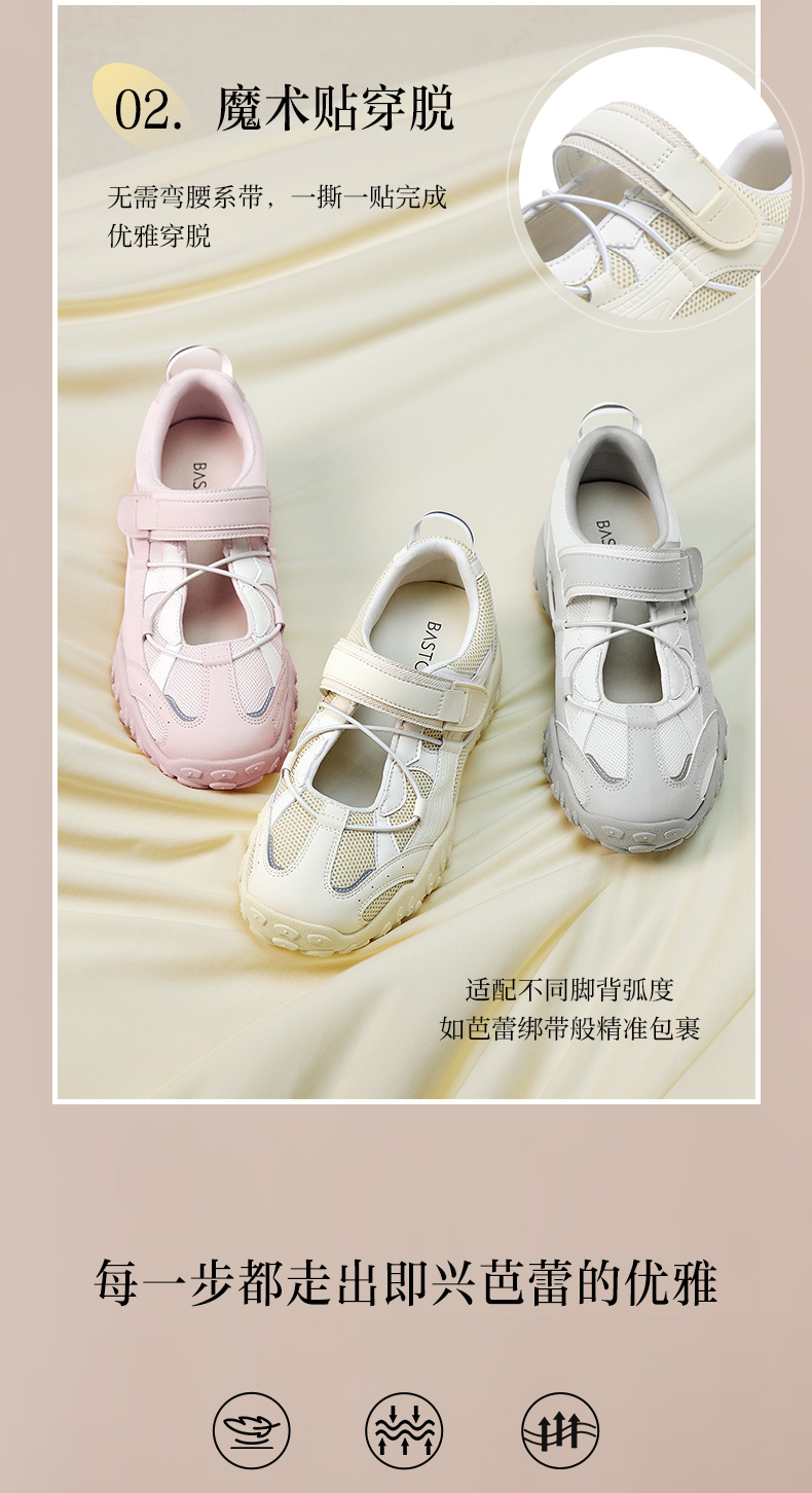 BASTO(百思图),品牌拥有17年历史,秉承优雅、甜美、清新的设计理念,主张“好嫁风”的产品风格,将甜美俏丽的少女情怀融合优雅气质的时尚品味,塑造出唯美优雅、受欢迎的女鞋款式。主打以女性温柔与亲和力为特色的流行时尚产品,糅合雅致又富有亲和力的裸粉色调,淑媛端庄、清新甜美。目前品牌已开设线下门店达1400多家。