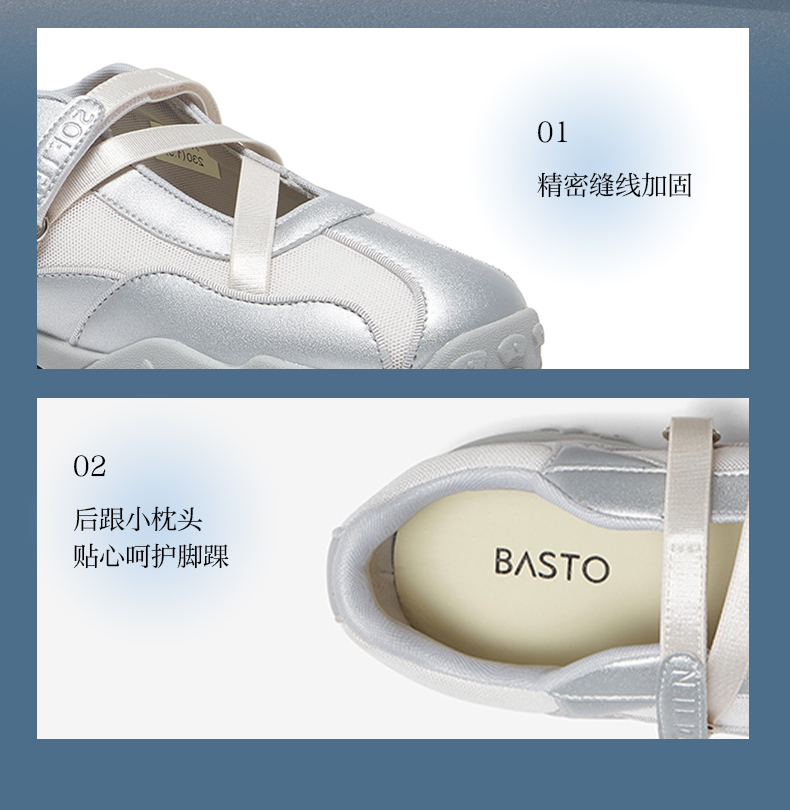 BASTO(百思图),品牌拥有17年历史,秉承优雅、甜美、清新的设计理念,主张“好嫁风”的产品风格,将甜美俏丽的少女情怀融合优雅气质的时尚品味,塑造出唯美优雅、受欢迎的女鞋款式。主打以女性温柔与亲和力为特色的流行时尚产品,糅合雅致又富有亲和力的裸粉色调,淑媛端庄、清新甜美。目前品牌已开设线下门店达1400多家。