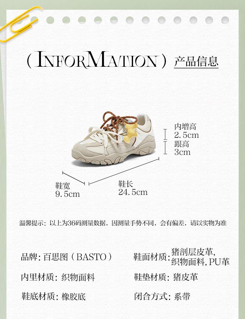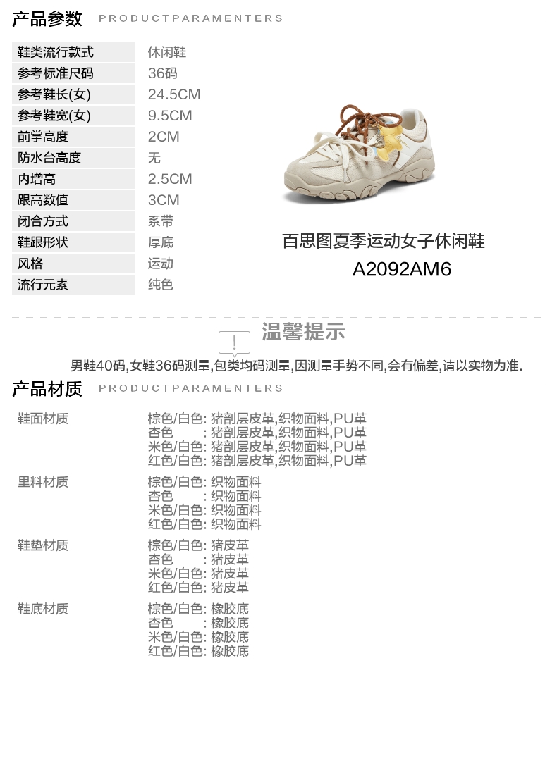 | 鞋帮:低帮 | 鞋底材质:橡胶底 | 内增高:2.5CM | 鞋面材质:PU革织物面料猪剖层皮革 | 闭合方式:系带 |