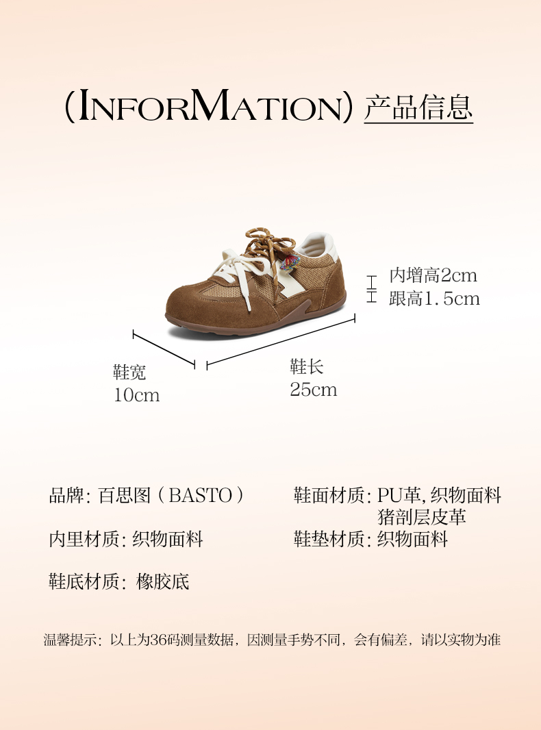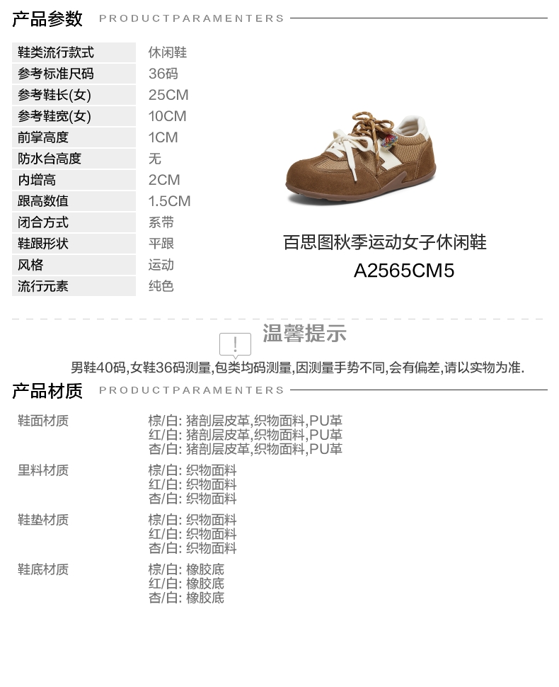 | 鞋帮:低帮 | 鞋底材质:橡胶底 | 内增高:2CM | 鞋面材质:猪剖层皮革PU革织物面料 | 闭合方式:系带 |