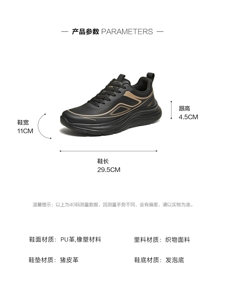 | 风格:运动 | 色系:黑色 | 跟高数值:4.5CM | 40码鞋宽参考(男):11CM | 性别:男子 |