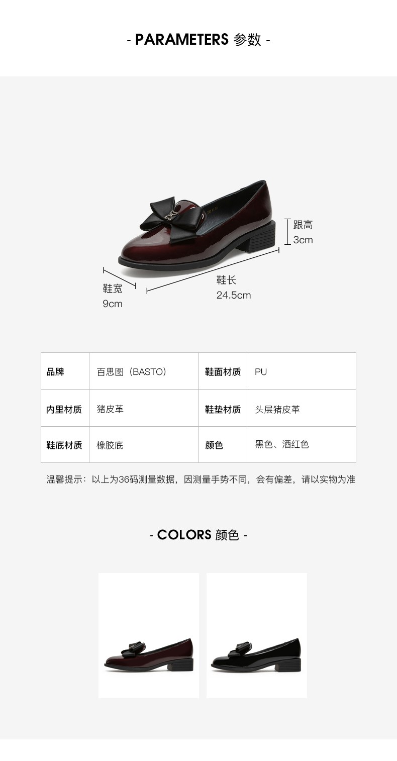 | 色系:黑色 | 跟高数值:3CM | 性别:女子 | 里料材质:猪皮革 | 制鞋工艺:胶贴皮鞋 |