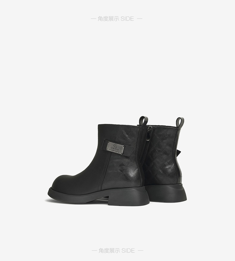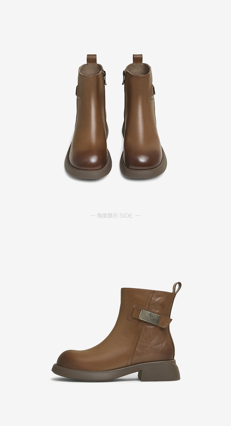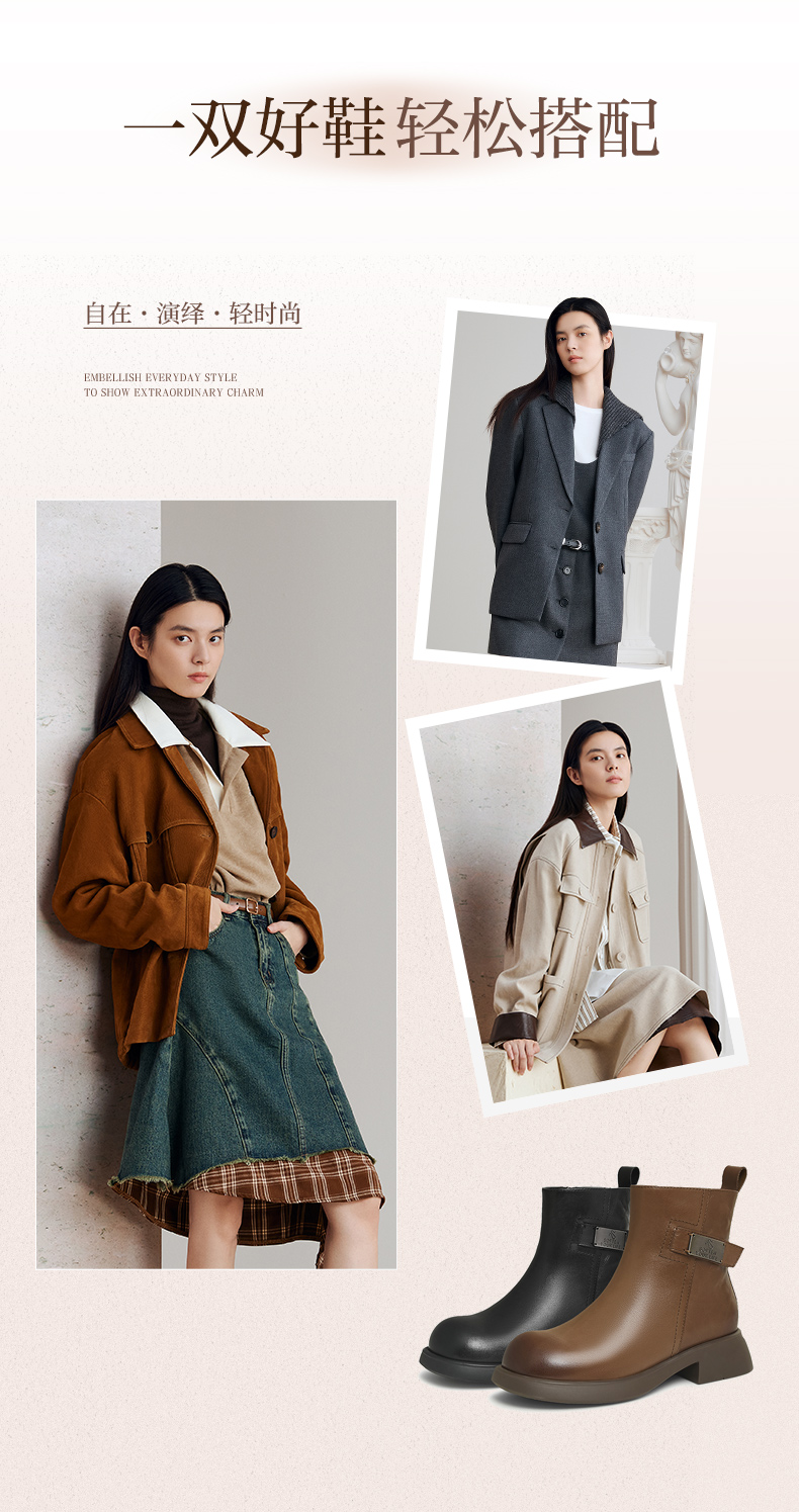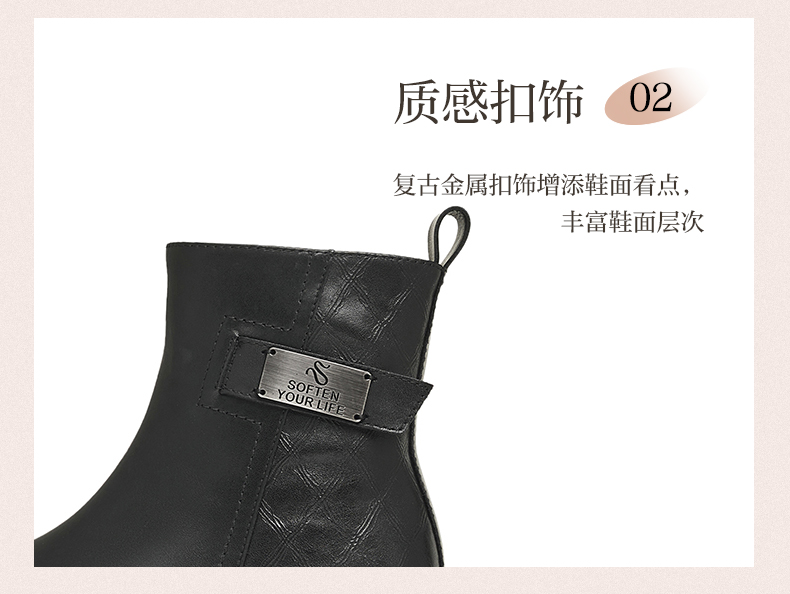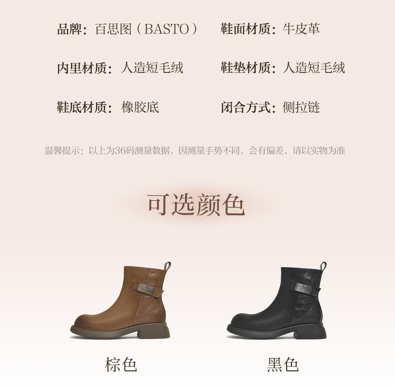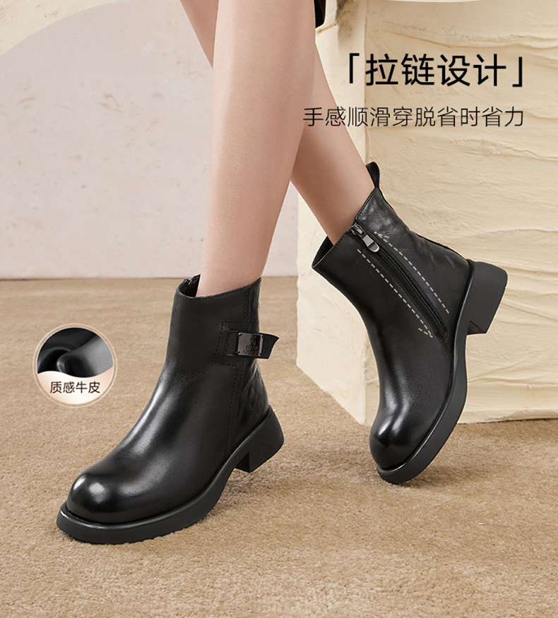 | 鞋类流行款式:短靴 | 鞋头款式:圆头 | 执行标准:皮鞋 QB/T1002-2015 | 跟高范围:中跟鞋(3-5CM) | 鞋面图案:纯色 |