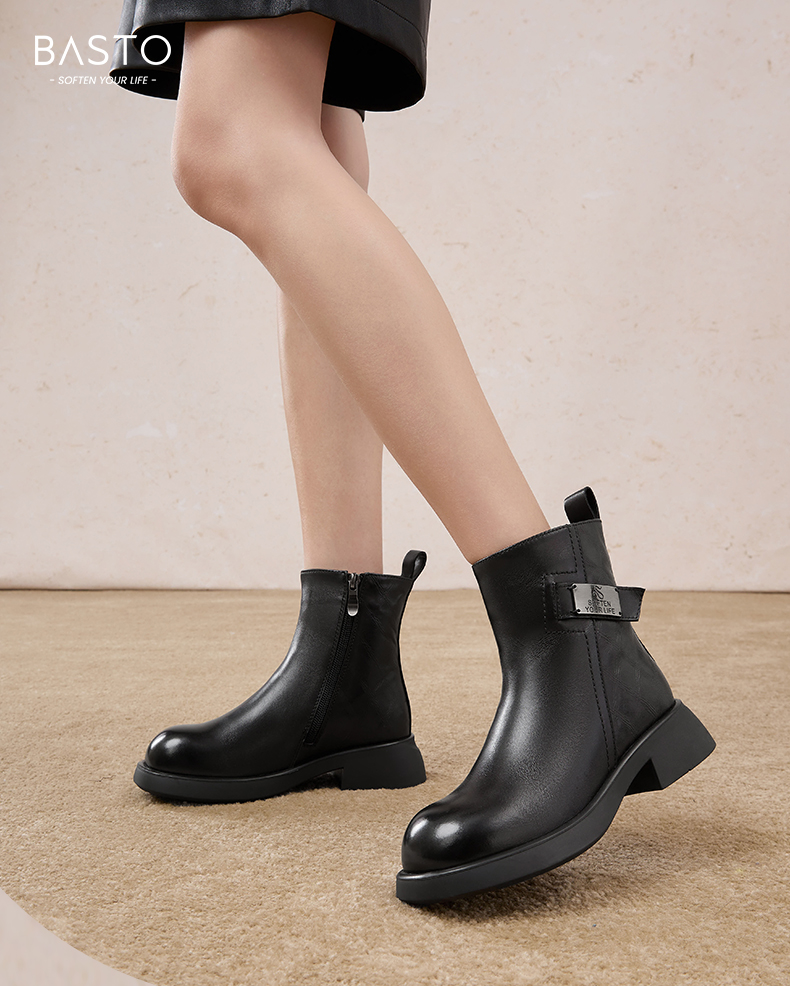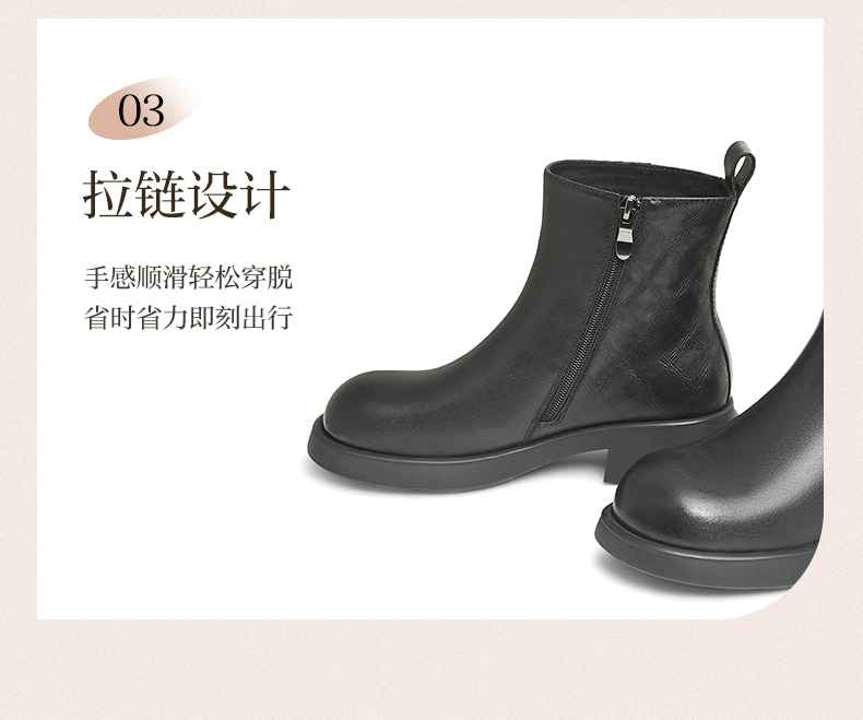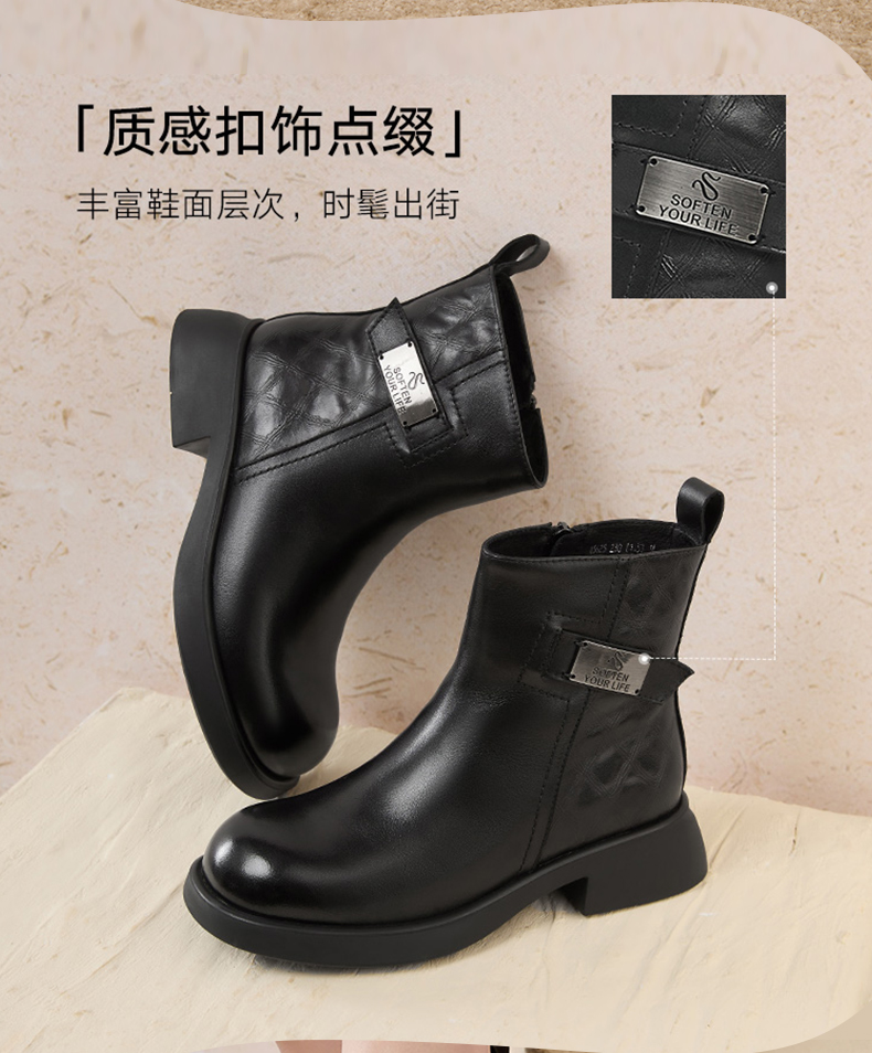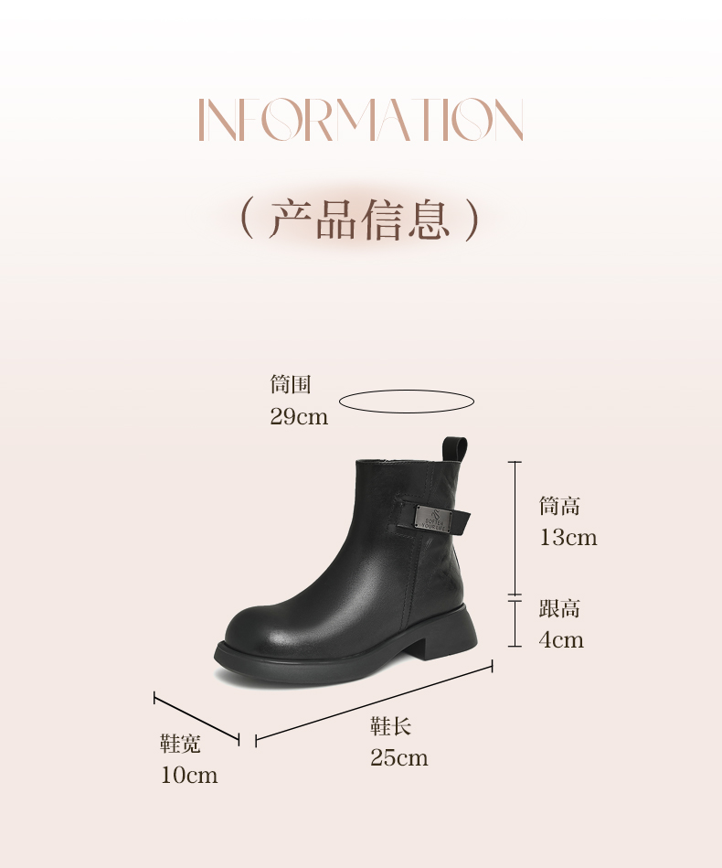 | 鞋类流行款式:短靴 | 鞋头款式:圆头 | 执行标准:皮鞋 QB/T1002-2015 | 跟高范围:中跟鞋(3-5CM) | 鞋面图案:纯色 |