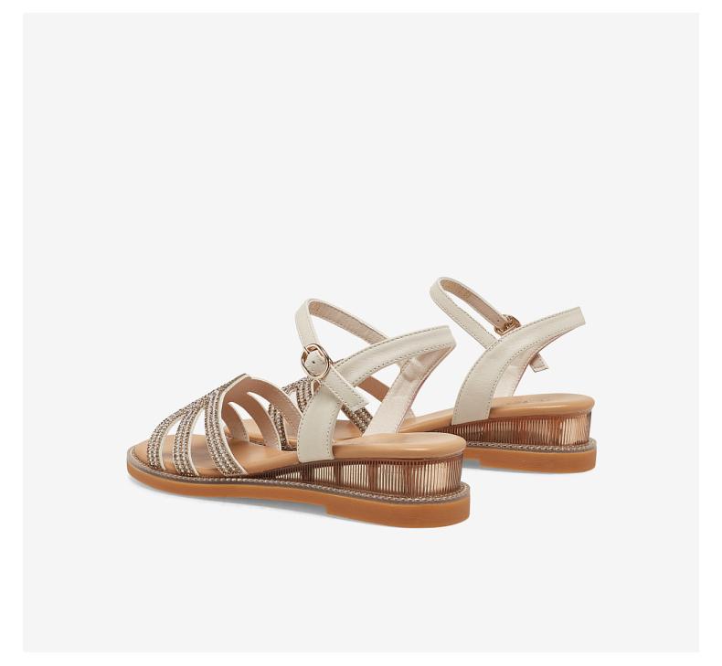 | 鞋头款式:露趾 | 鞋底材质:橡胶底 | 鞋面图案:纯色 | 鞋跟形状:坡跟 | 鞋面材质:牛皮革PU |