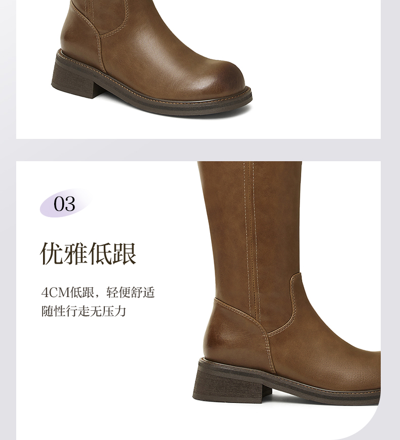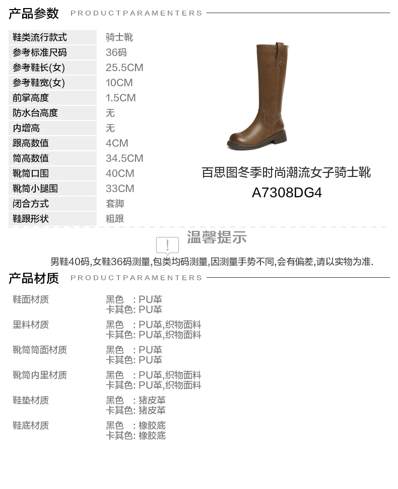 | 风格:时尚潮流 | 色系:棕色 | 跟高数值:4CM | 性别:女子 | 筒高数值:34.5CM |