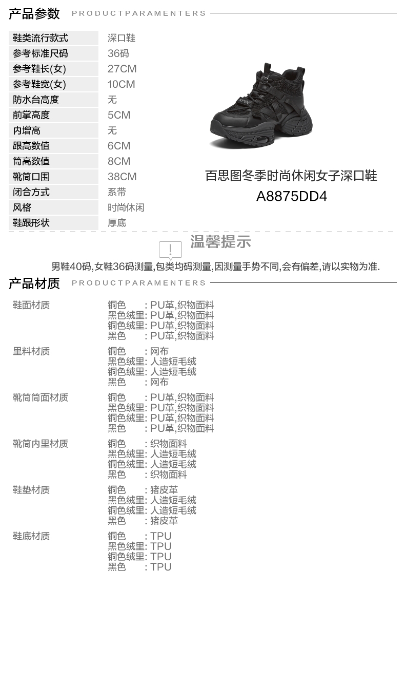 | 款式季节:冬季 | 鞋垫材质:人造短毛绒 | 渠道划分:线下同步 | 前掌高度:5CM | 皮质特征:无 |