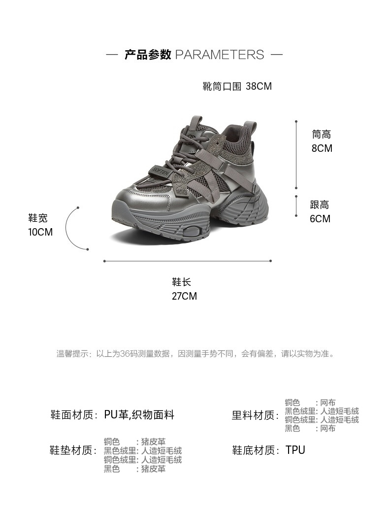 | 帮面材质:PU织物 | 靴筒口围:38CM | 风格分类:老爹鞋 | 上市时间:2024年冬季 | 生产/经销/进口厂家:丽荣鞋业(深圳)有限公司 |