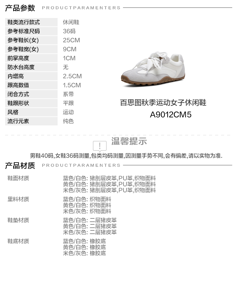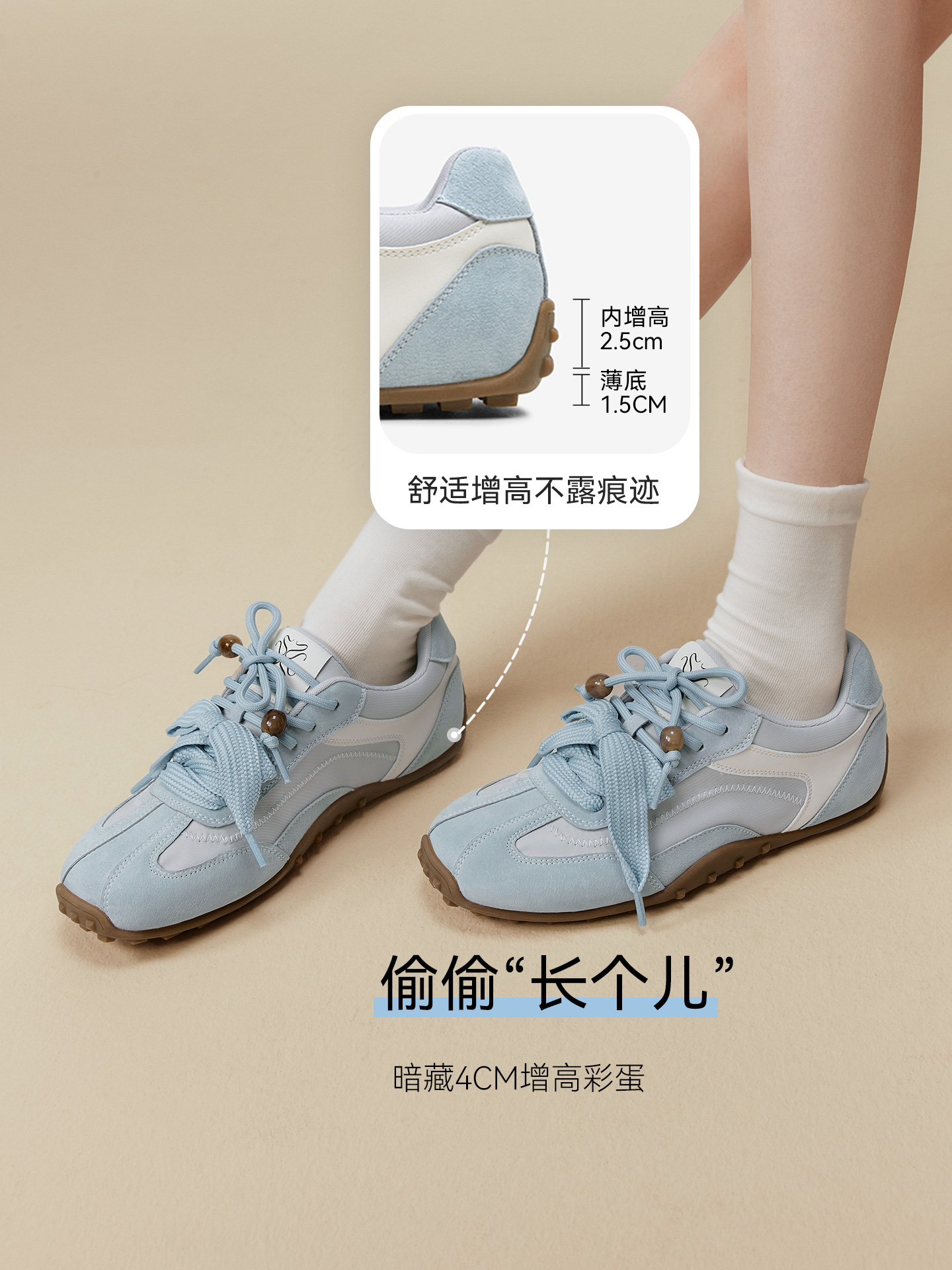 | 鞋帮:低帮 | 鞋底材质:橡胶底 | 内增高:2.5CM | 鞋面材质:PU革猪剖层皮革织物面料 | 闭合方式:系带 |