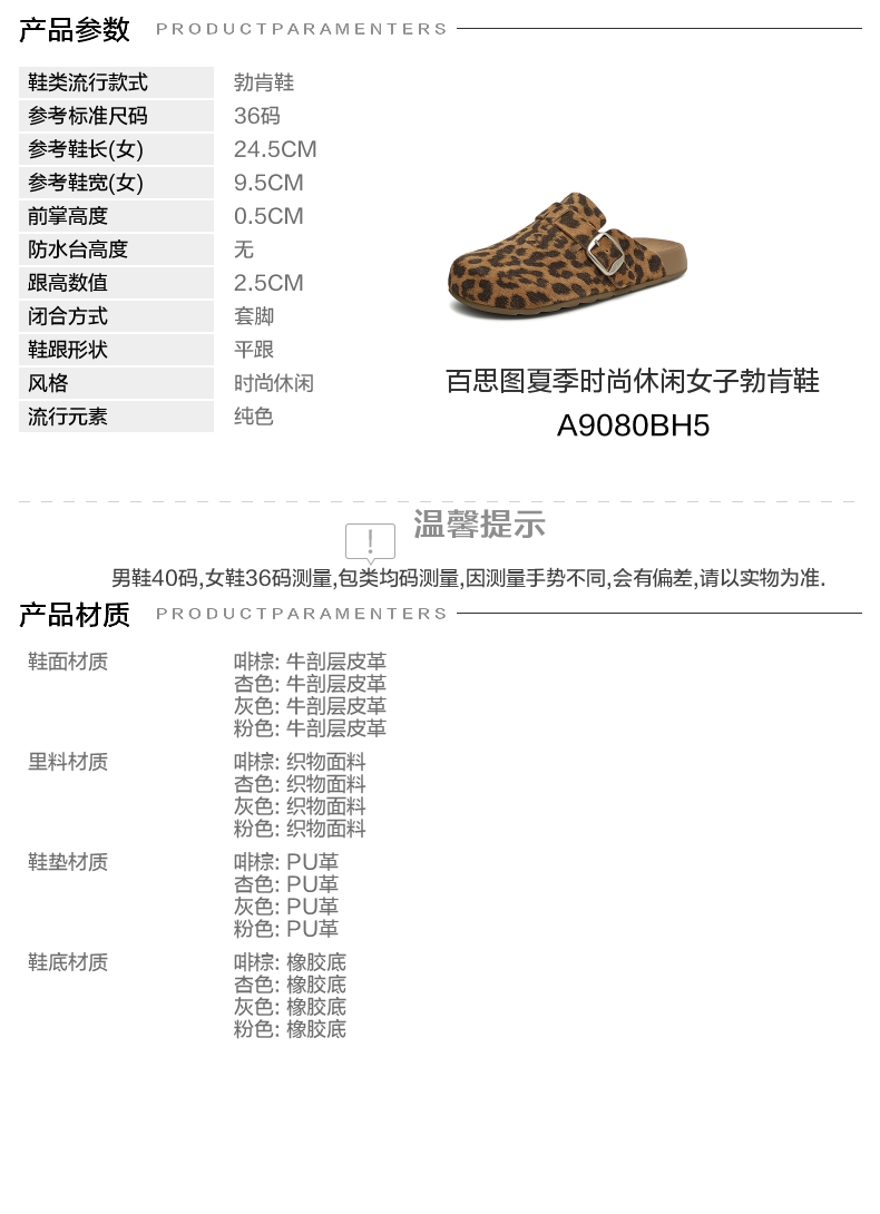 | 鞋类流行款式:勃肯鞋 | 鞋头款式:圆头 | 执行标准:舒适上班鞋Q/LR001-2023 | 跟高范围:低跟鞋(小于3CM) | 鞋面图案:纯色 |
