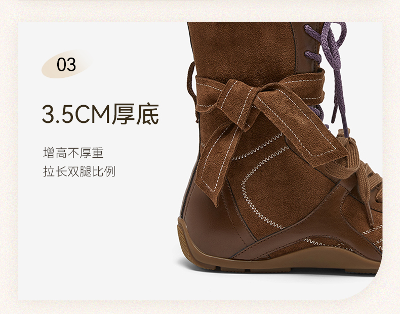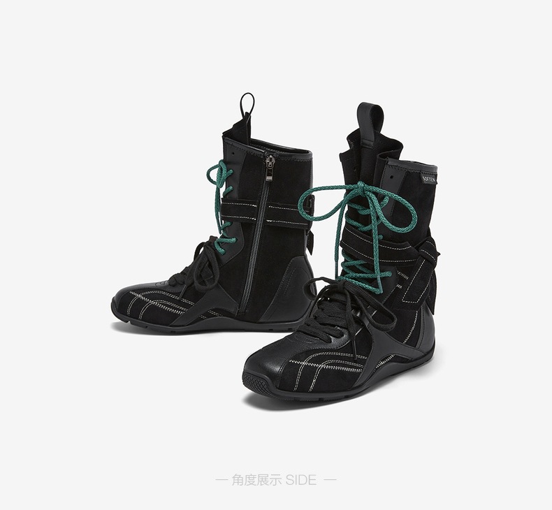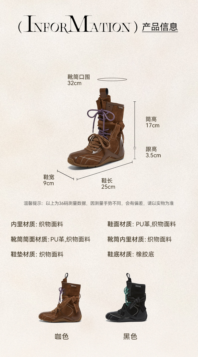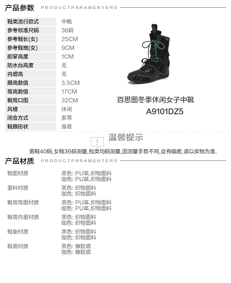 | 风格:休闲 | 鞋面内里材质:织物 | 色系:黑色 | 跟高数值:3.5CM | 筒高数值:17CM |
