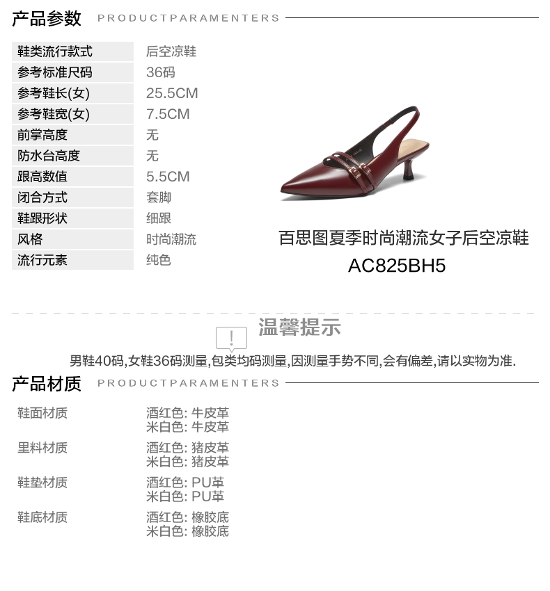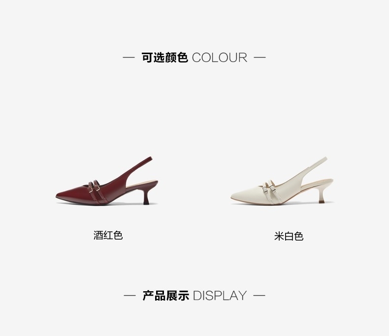 | 鞋类流行款式:后空凉鞋 | 鞋头款式:尖头 | 执行标准:皮凉鞋GB/T22756-2017 | 跟高范围:中跟鞋(3-5CM) | 鞋面图案:纯色 |