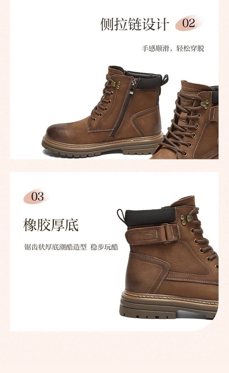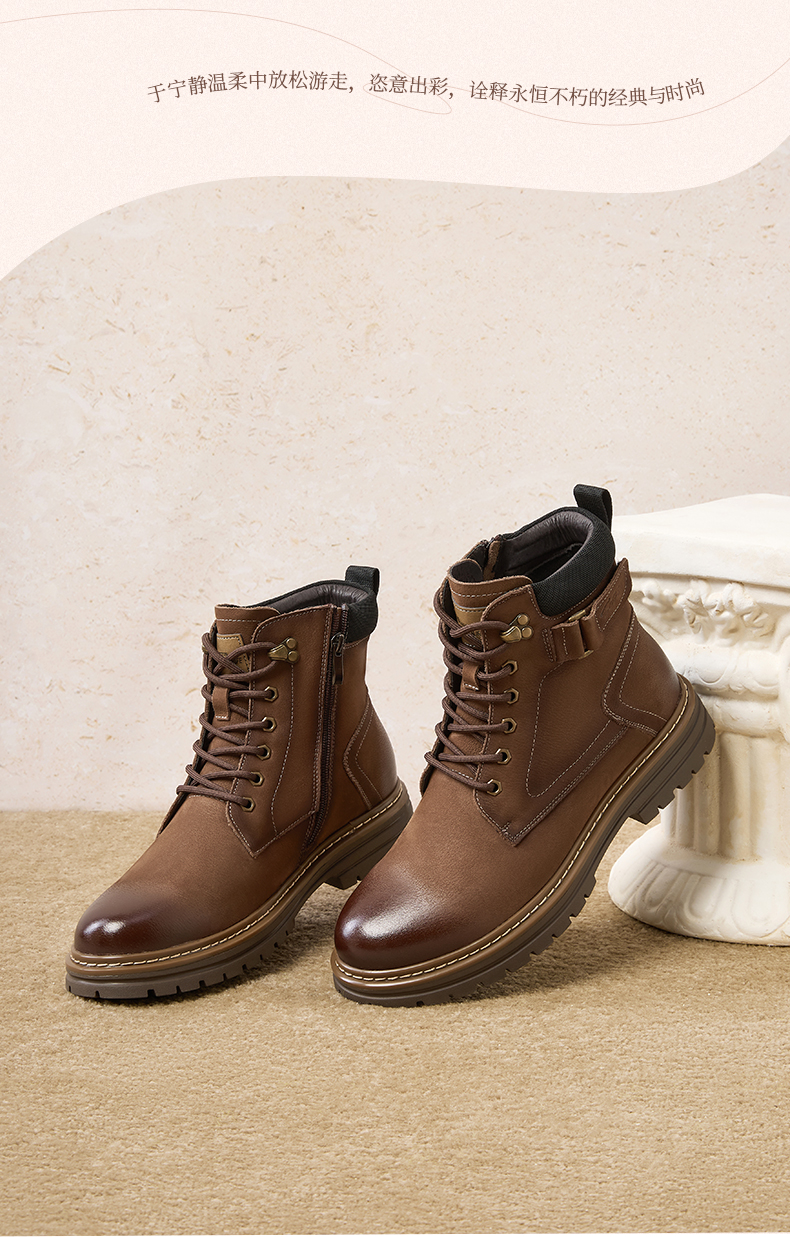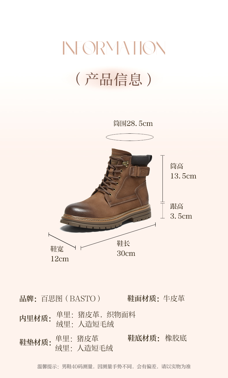 | 跟高数值:3.5CM | 筒高数值:13.5CM | 性别:男子 | 靴筒筒面材质:牛皮革 | 里料材质:人造短毛绒 |