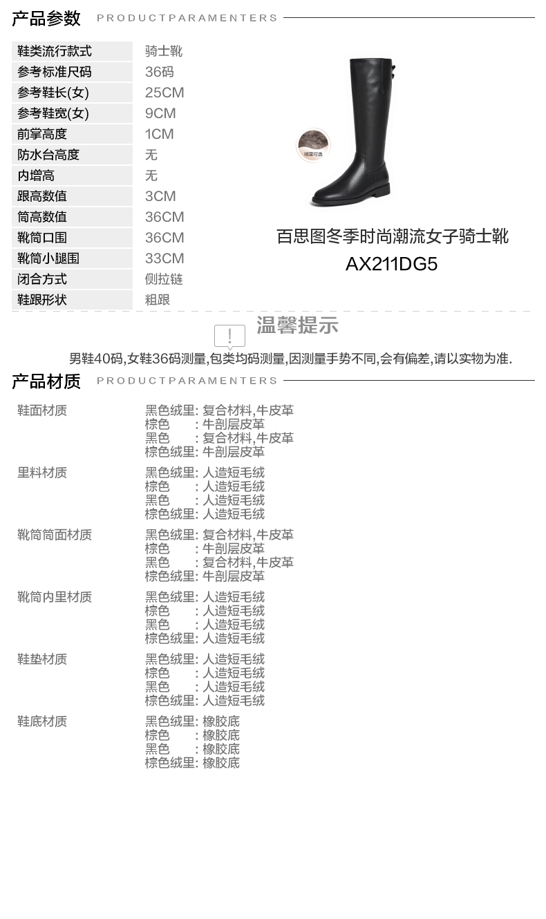 | 靴筒筒面材质:复合材料牛皮革 | 靴筒小腿围:33CM | 里料材质:人造短毛绒 | 制鞋工艺:胶贴皮鞋 | 鞋垫材质:人造短毛绒 |