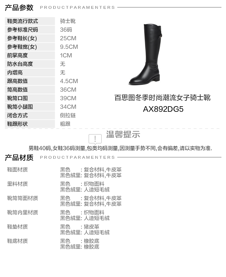 | 风格:时尚潮流 | 色系:黑色 | 跟高数值:4.5CM | 性别:女子 | 筒高数值:36CM |
