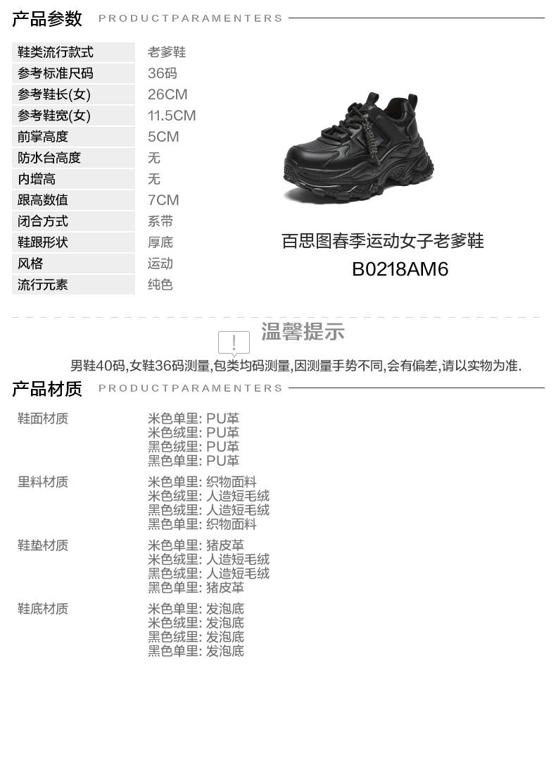 | 鞋跟形状:厚底 | 参考鞋长(女):26CM | 流行元素:纯色 | 参考鞋宽(女):11.5CM | 风格:运动 |