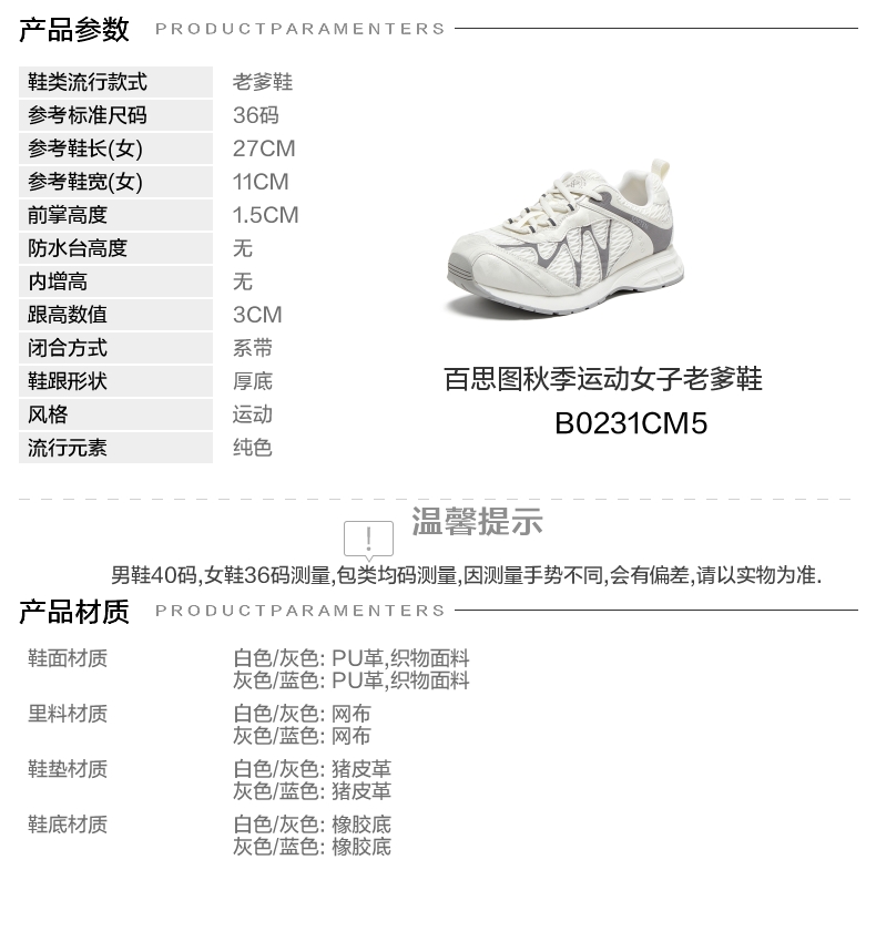 | 鞋跟形状:厚底 | 参考鞋长(女):27CM | 流行元素:纯色 | 参考鞋宽(女):11CM | 风格:运动 |