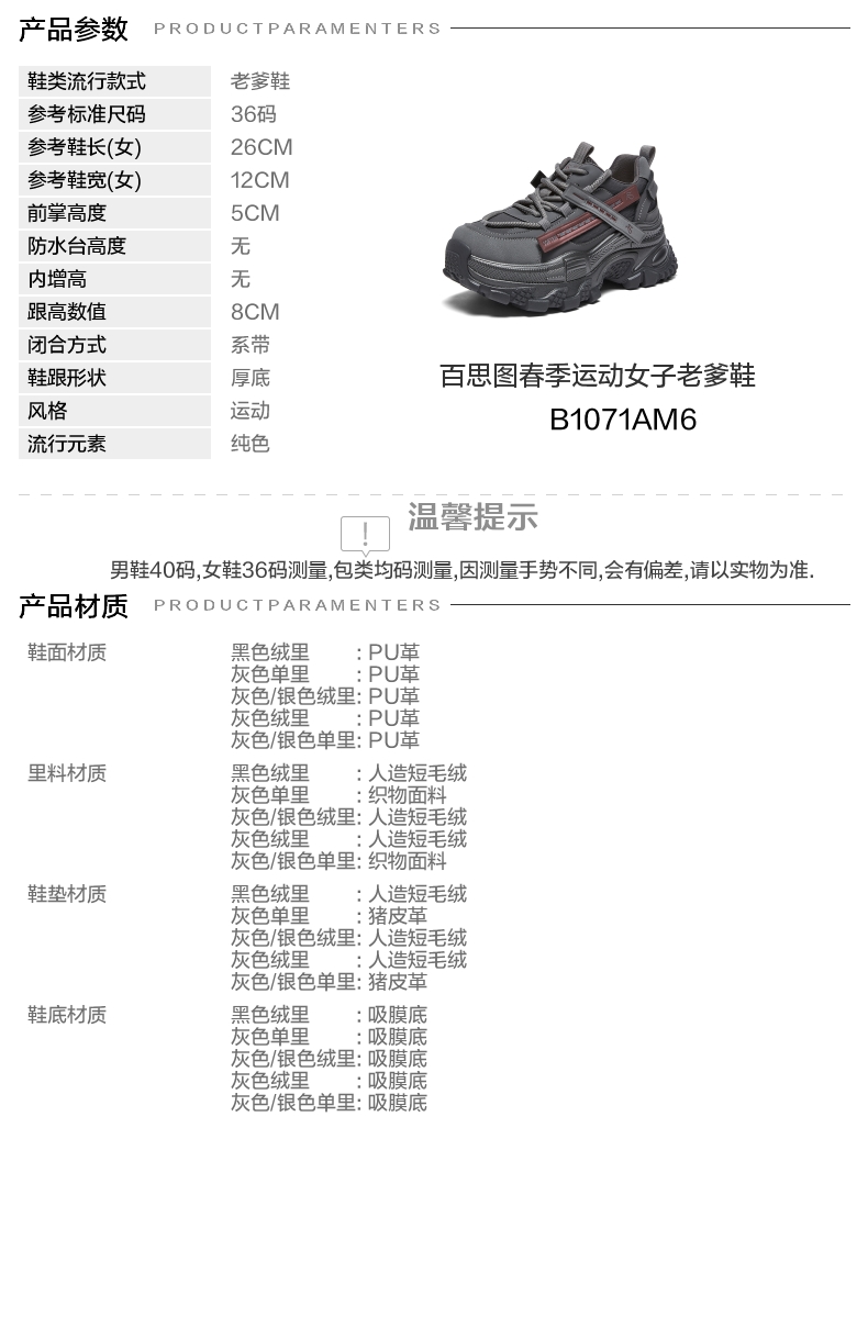 | 鞋跟形状:厚底 | 参考鞋长(女):26CM | 流行元素:纯色 | 参考鞋宽(女):12CM | 风格:运动 |