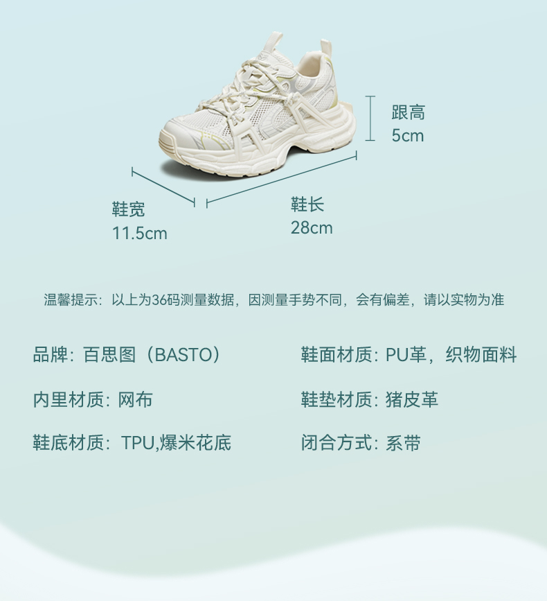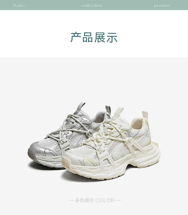 BASTO(百思图),品牌拥有17年历史,秉承优雅、甜美、清新的设计理念,主张“好嫁风”的产品风格,将甜美俏丽的少女情怀融合优雅气质的时尚品味,塑造出唯美优雅、受欢迎的女鞋款式。主打以女性温柔与亲和力为特色的流行时尚产品,糅合雅致又富有亲和力的裸粉色调,淑媛端庄、清新甜美。目前品牌已开设线下门店达1400多家。