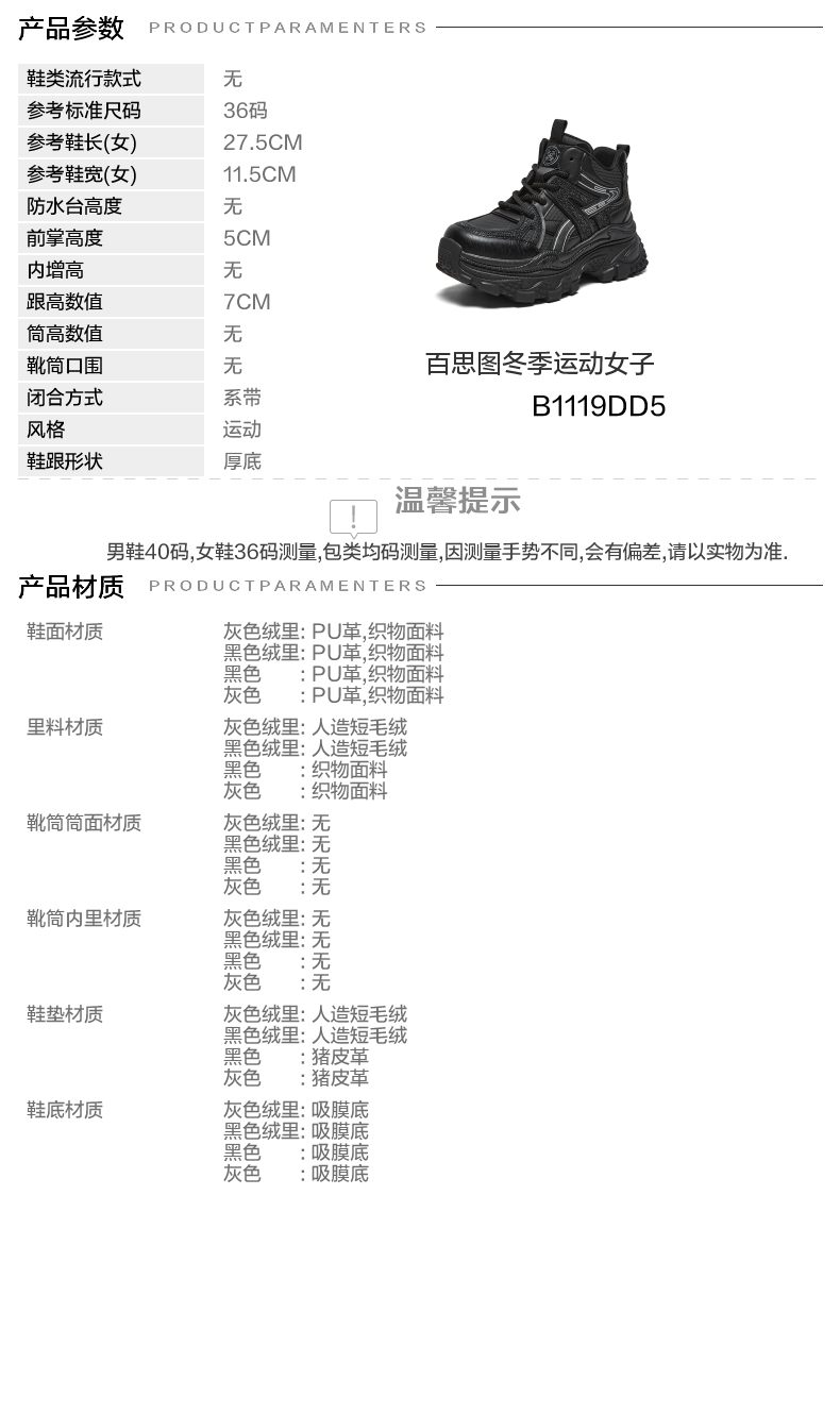 | 鞋垫材质:猪皮革 | 款式季节:冬季 | 前掌高度:5CM | 皮质特征:无 | 防水台高度:无 |