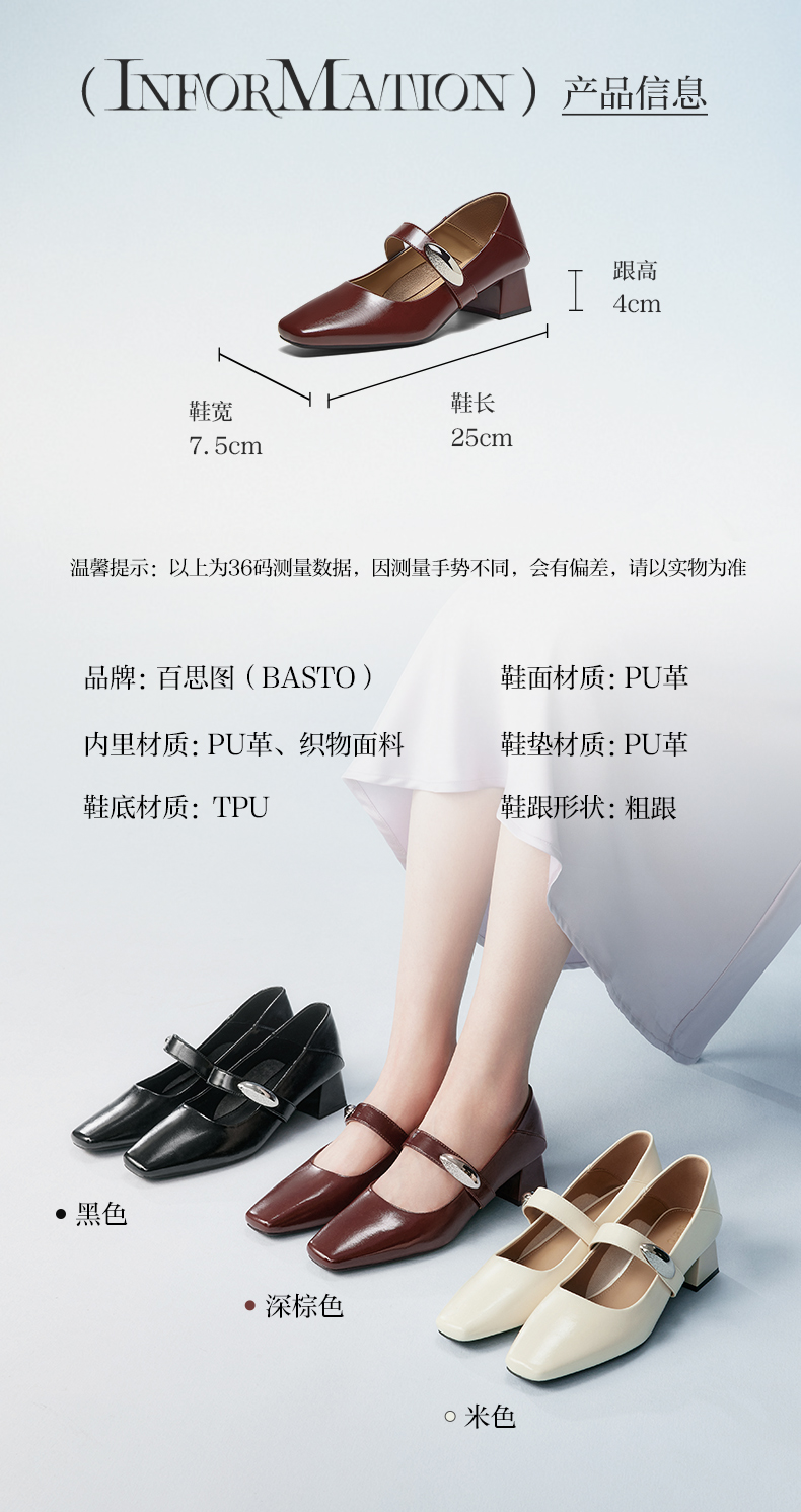 | 参考标准尺码:36码 | 跟高数值:4CM | 性别:女子 | 里料材质:织物面料PU革 | 制鞋工艺:胶贴皮鞋 |
