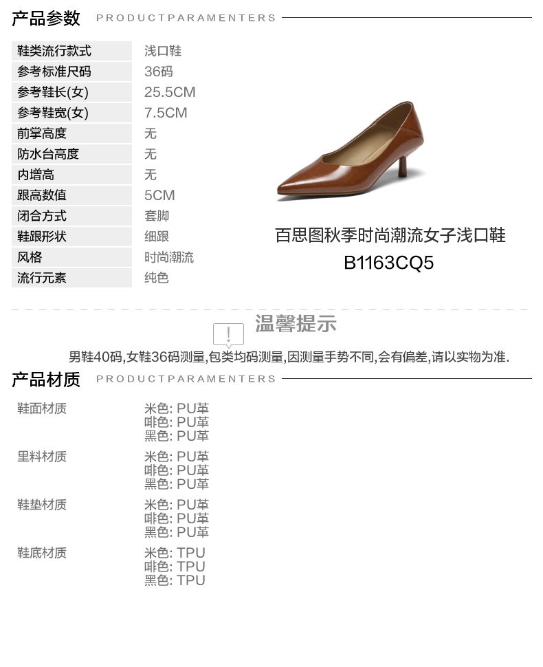 | 鞋头款式:尖头 | 鞋底材质:TPU | 鞋面图案:纯色 | 内增高:无 | 鞋跟形状:细跟 |