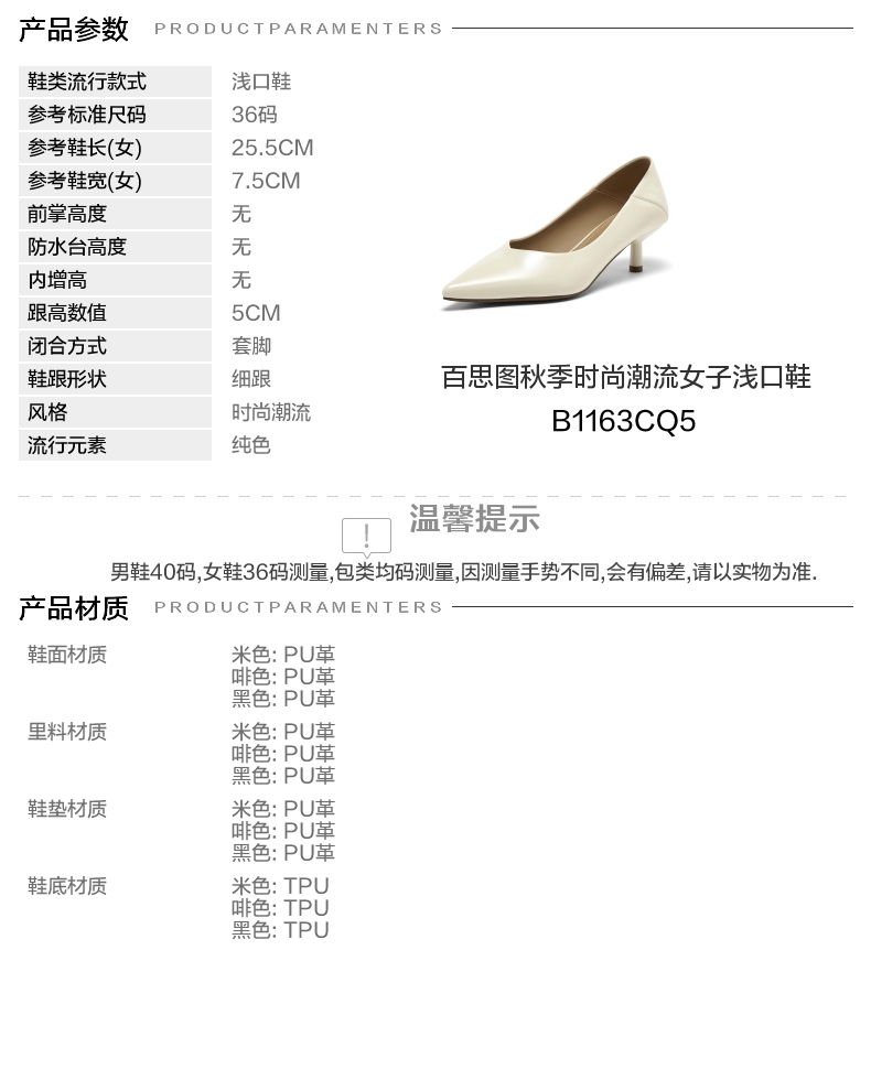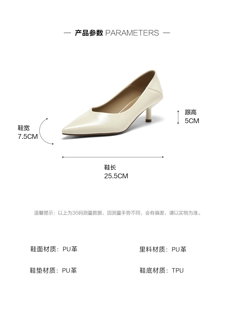 | 鞋头款式:尖头 | 鞋底材质:TPU | 鞋面图案:纯色 | 内增高:无 | 鞋跟形状:细跟 |