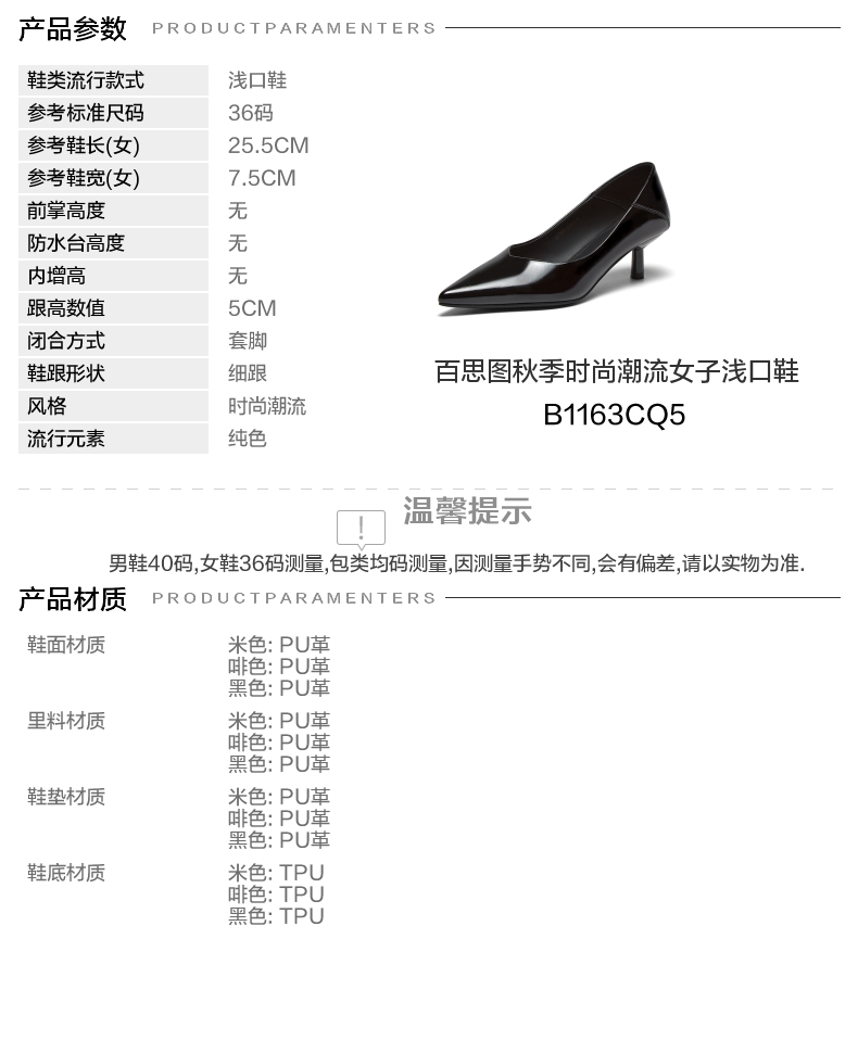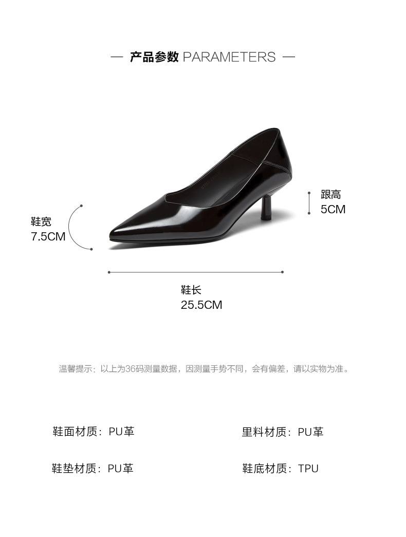 | 鞋头款式:尖头 | 鞋底材质:TPU | 鞋面图案:纯色 | 内增高:无 | 鞋跟形状:细跟 |