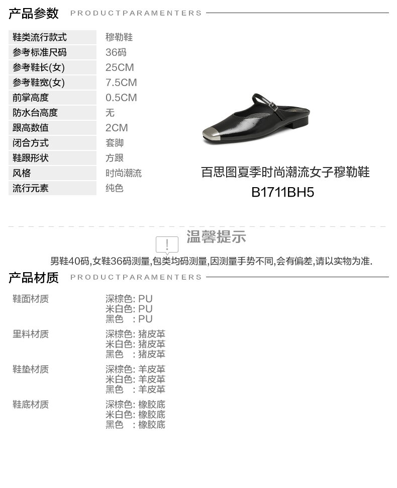 | 鞋类流行款式:穆勒鞋 | 鞋头款式:方头 | 执行标准:舒适上班鞋Q/LR001-2023 | 跟高范围:低跟鞋(小于3CM) | 鞋面图案:纯色 |