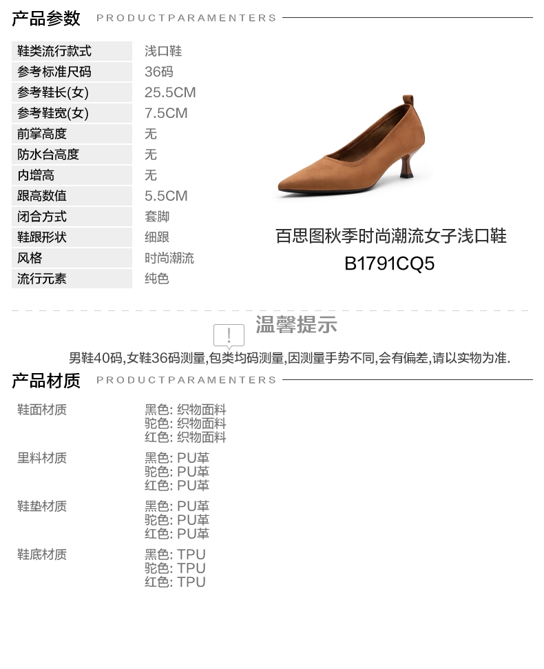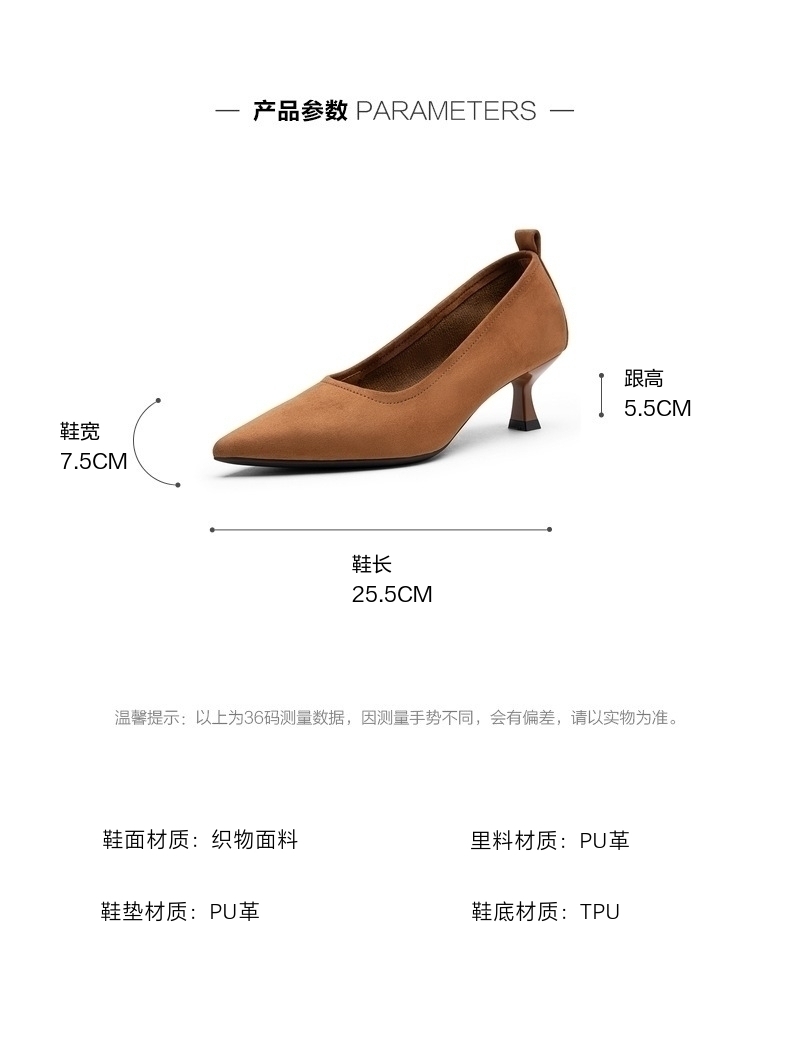 | 鞋头款式:尖头 | 鞋底材质:TPU | 鞋面图案:纯色 | 内增高:无 | 鞋跟形状:细跟 |