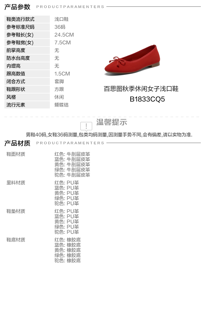| 上市时间:2025年秋季 | 生产/经销/进口厂家:丽荣鞋业(深圳)有限公司 | 鞋类流行款式:浅口鞋 | 鞋头款式:圆头 | 执行标准:Q/LR001-2023 |