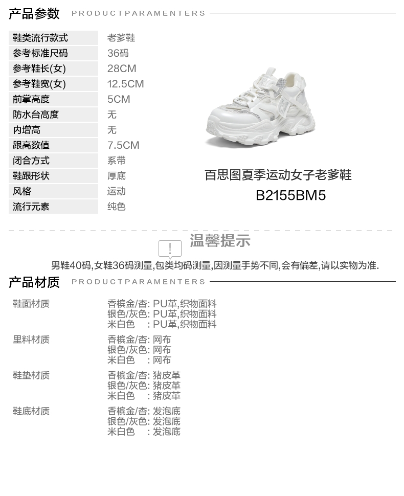 | 色系:米白 | 参考标准尺码:36码 | 跟高数值:7.5CM | 性别:女子 | 里料材质:网布 |