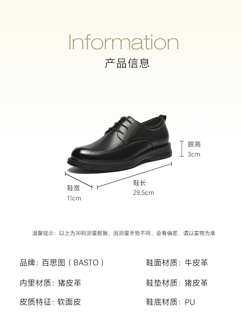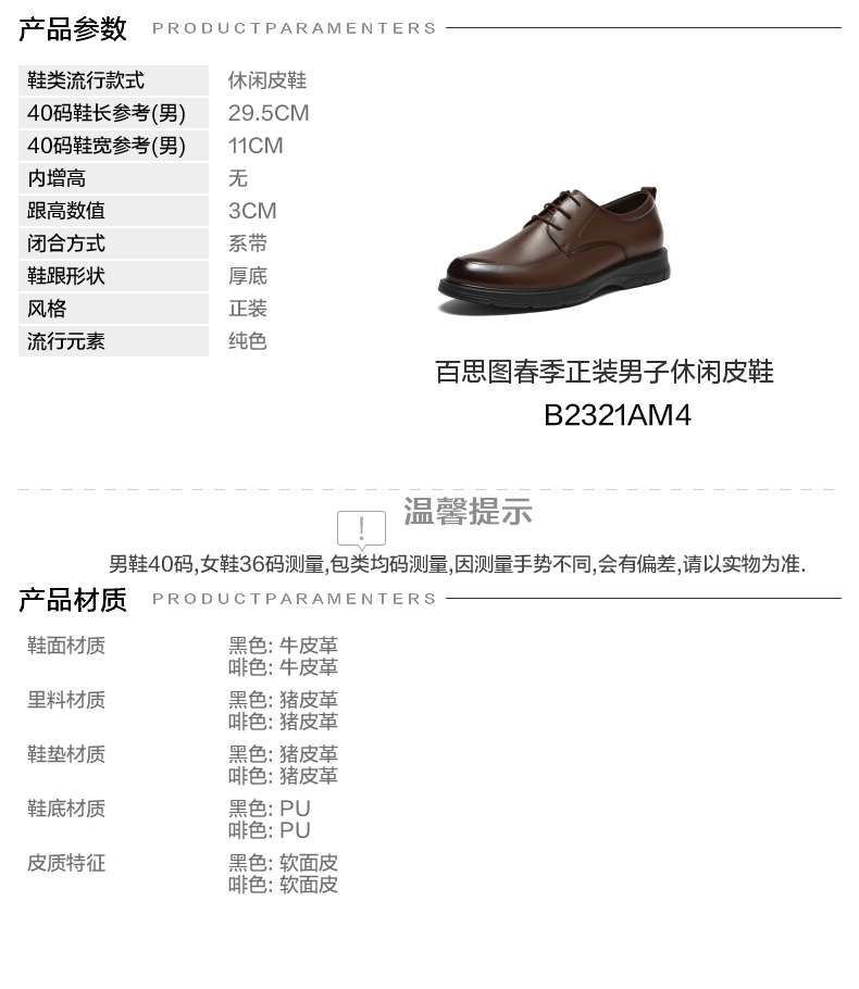 | 风格:正装 | 色系:啡色 | 跟高数值:3CM | 40码鞋宽参考(男):11CM | 性别:男子 |