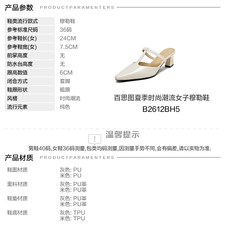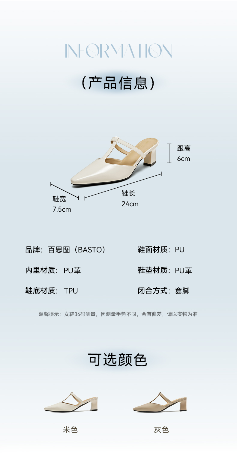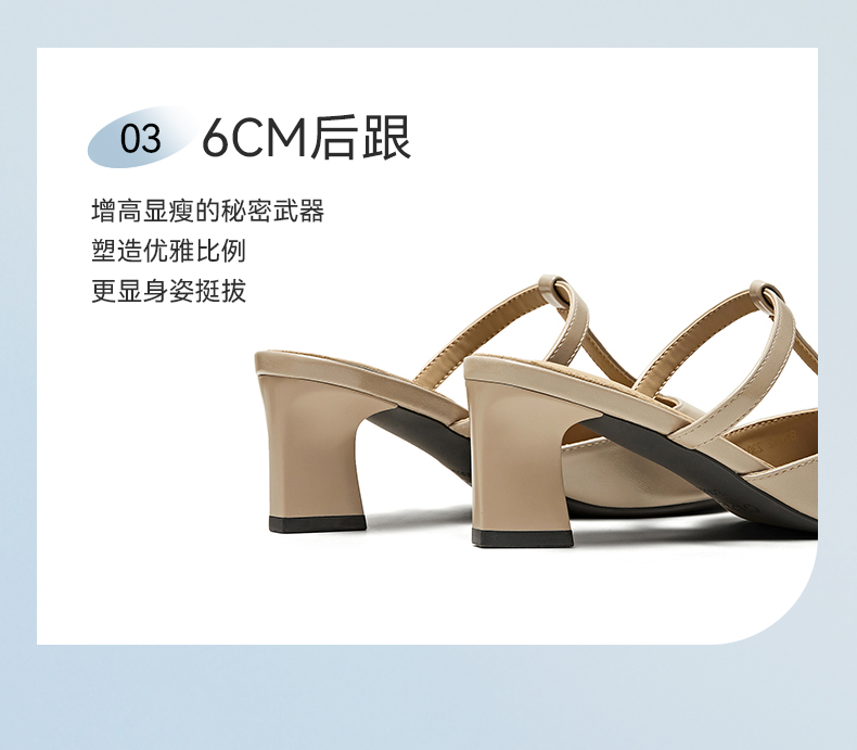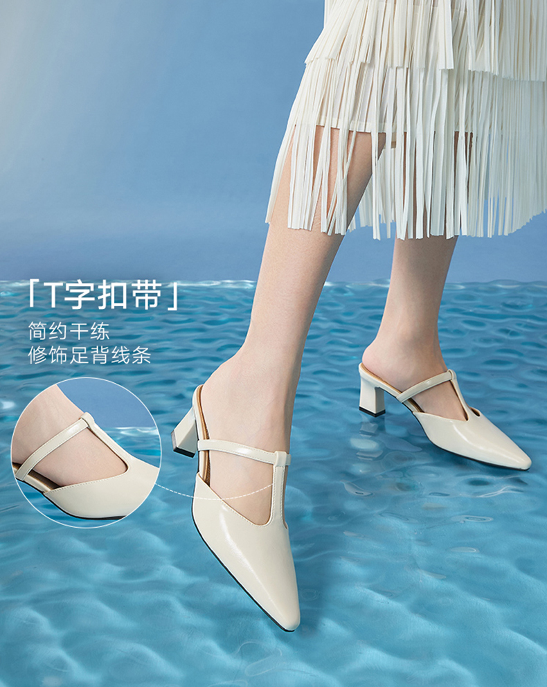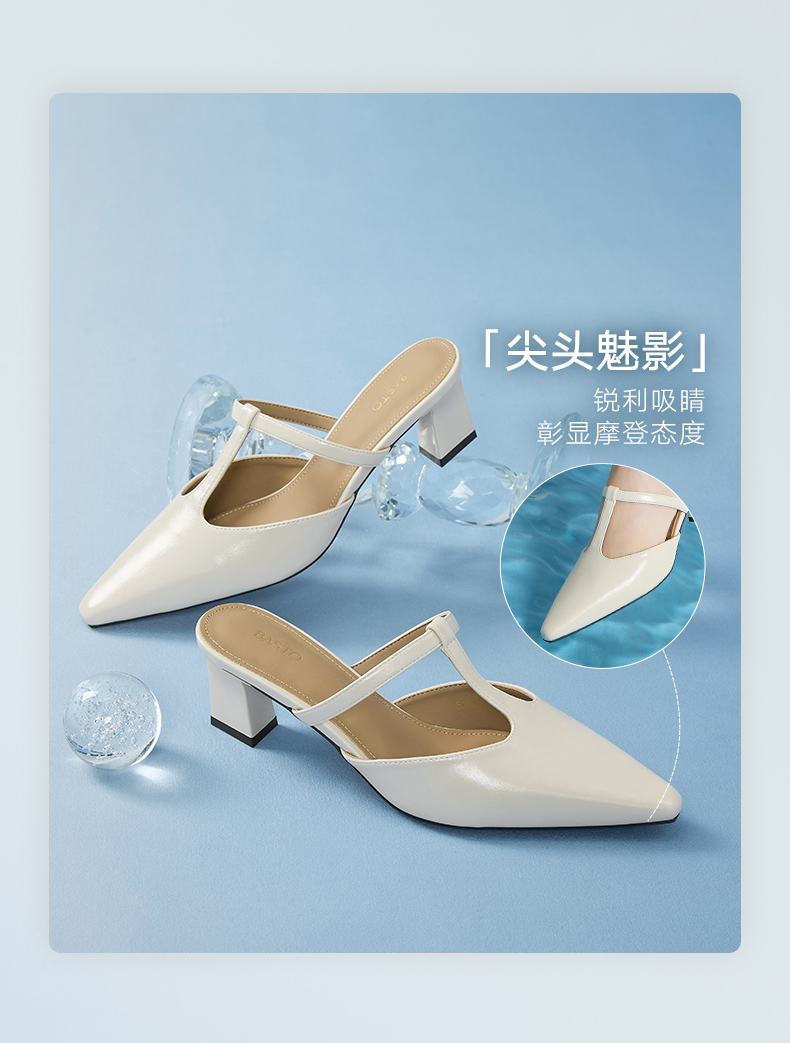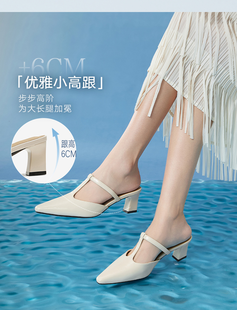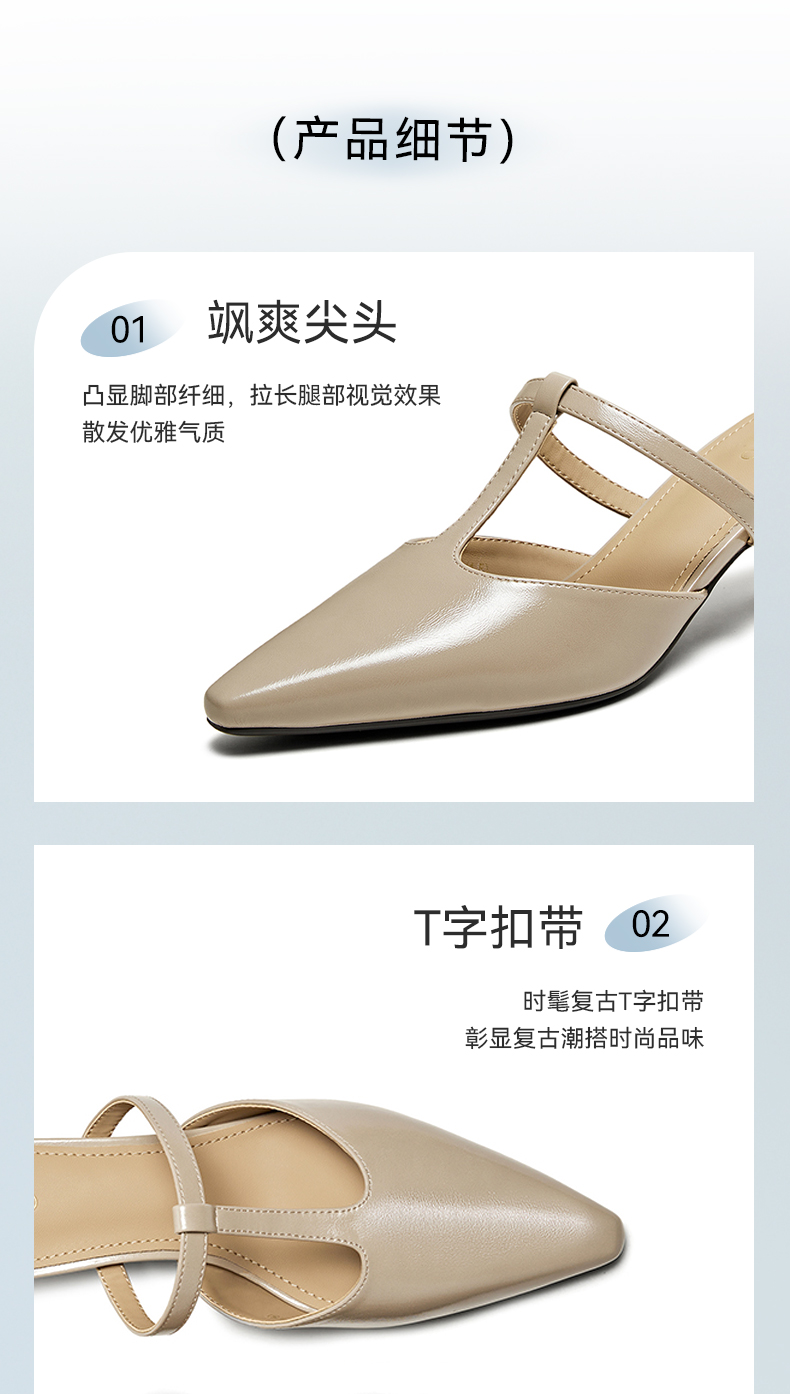 | 鞋类流行款式:穆勒鞋 | 鞋头款式:尖头 | 执行标准:皮凉鞋GB/T22756-2017 | 跟高范围:高跟鞋(6-8CM) | 鞋面图案:纯色 |