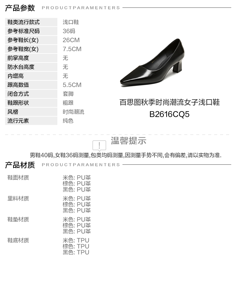 | 鞋头款式:尖头 | 鞋底材质:TPU | 鞋面图案:纯色 | 内增高:无 | 鞋跟形状:粗跟 |