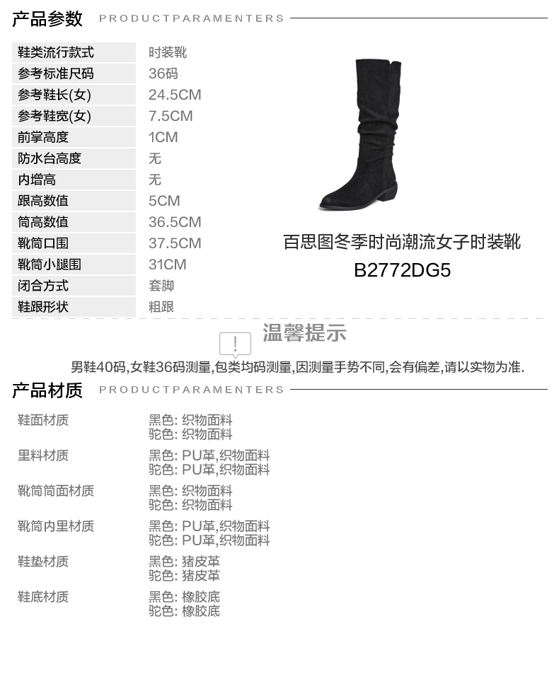 | 靴筒筒面材质:织物面料 | 靴筒小腿围:31CM | 里料材质:织物面料PU革 | 制鞋工艺:胶贴皮鞋 | 鞋垫材质:猪皮革 |