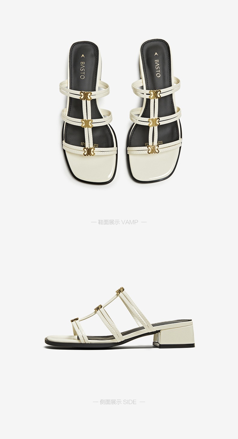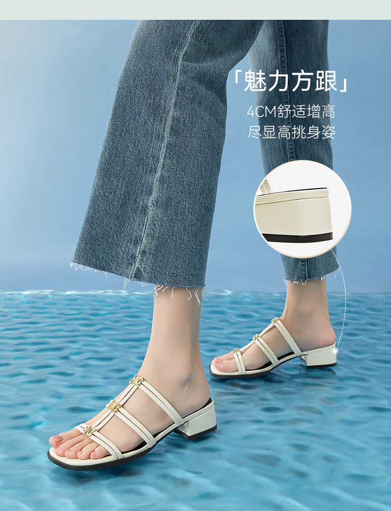 | 鞋类流行款式:拖鞋 | 鞋头款式:露趾 | 执行标准:皮凉鞋GB/T22756-2017 | 跟高范围:中跟鞋(3-5CM) | 鞋面图案:纯色 |