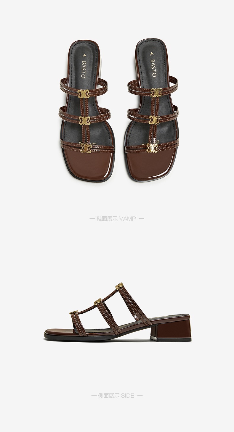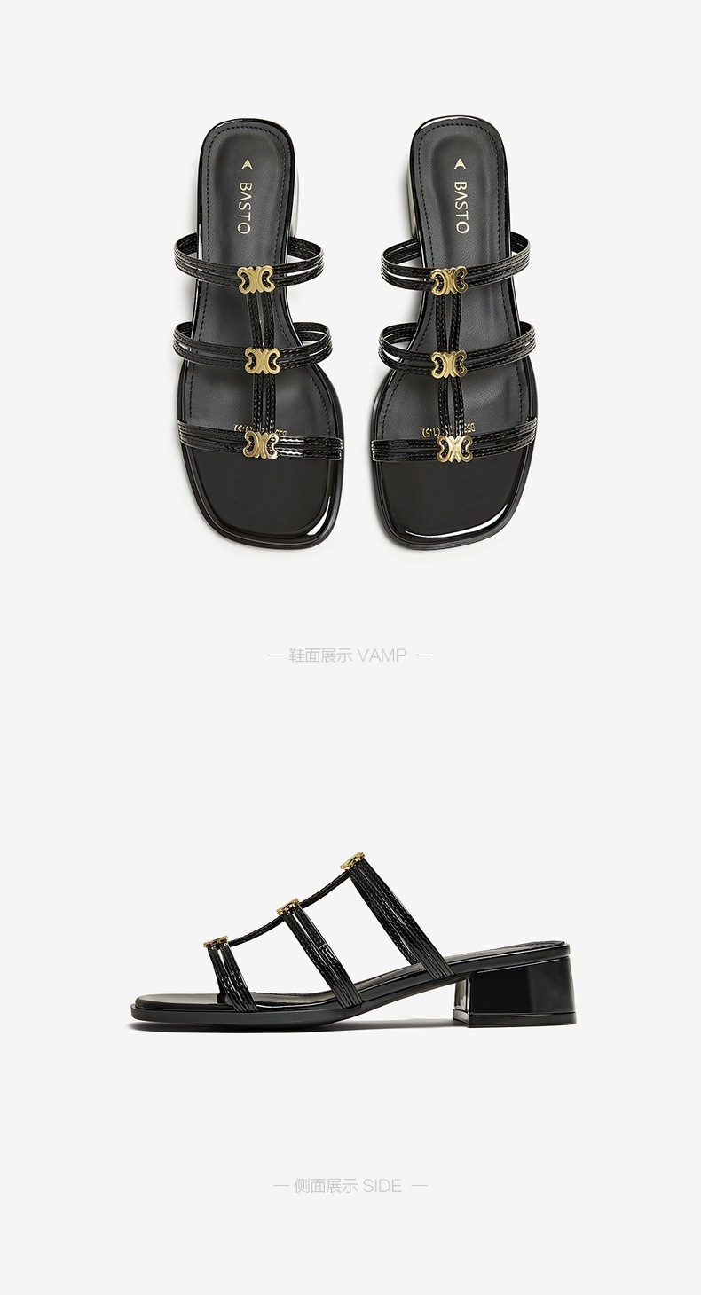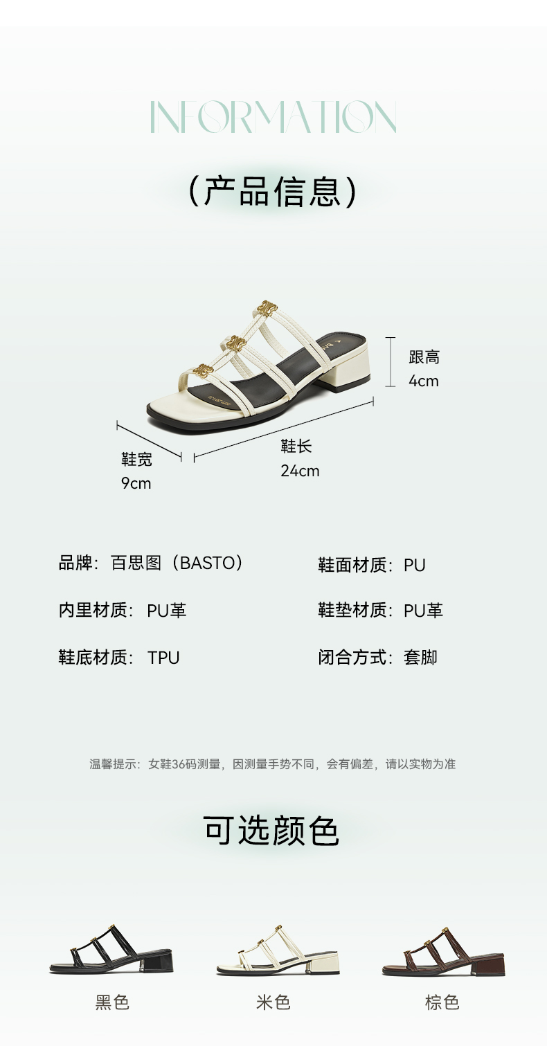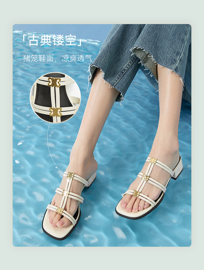 | 鞋类流行款式:拖鞋 | 鞋头款式:露趾 | 执行标准:皮凉鞋GB/T22756-2017 | 跟高范围:中跟鞋(3-5CM) | 鞋面图案:纯色 |