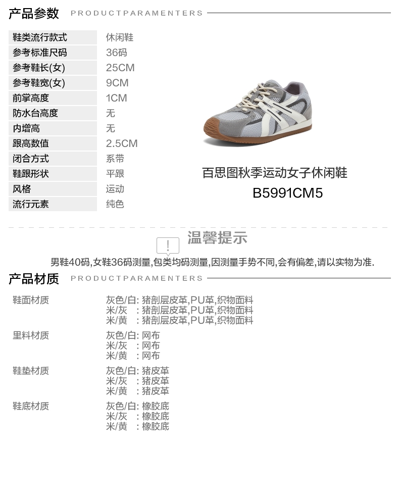 | 色系:灰色 | 跟高数值:2.5CM | 性别:女子 | 里料材质:网布 | 制鞋工艺:胶贴皮鞋 |