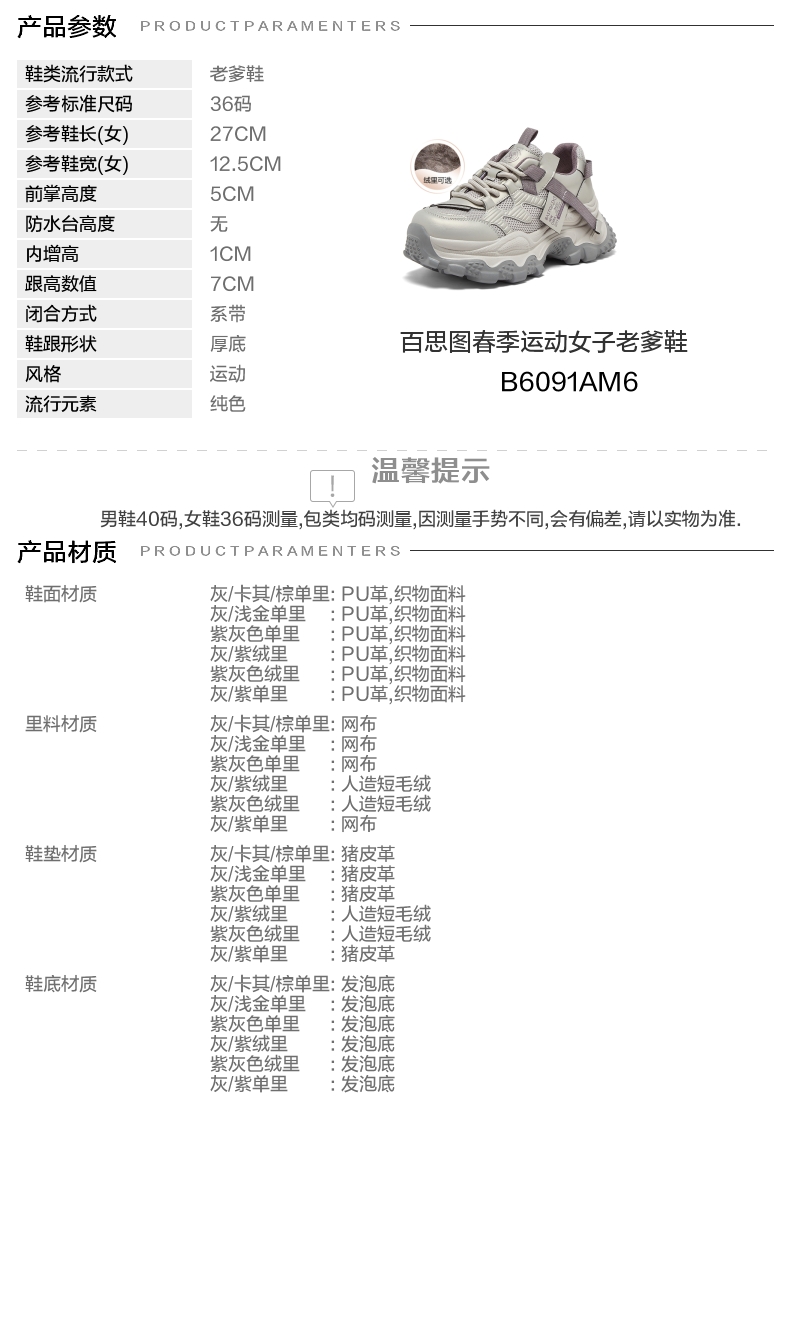 | 鞋跟形状:厚底 | 参考鞋长(女):27CM | 流行元素:纯色 | 参考鞋宽(女):12.5CM | 风格:运动 |