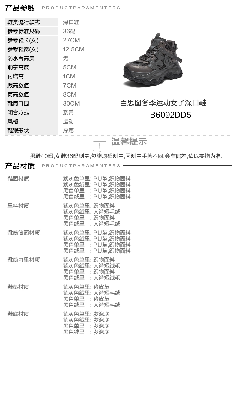 | 参考鞋宽(女):12.5CM | 风格:运动 | 鞋面内里材质:人造短毛绒 | 色系:紫色 | 跟高数值:7CM |